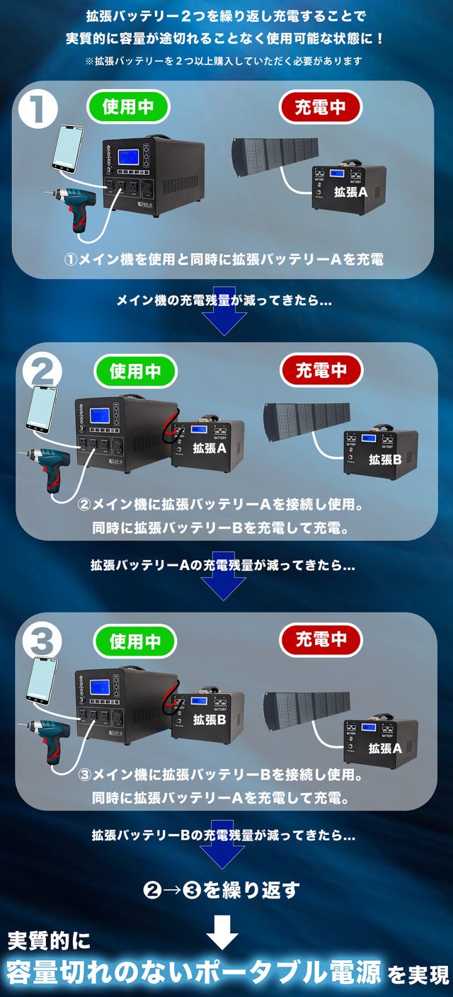2022/10/13 12:30CAMPFIREをご覧の皆様今回、ご紹介させて頂くポータブル電源は、今までのポータブル電源にはない特徴があります。メイン機に拡張バッテリーを接続または交換する方式により、電源供給を途切れる事なく続ける事ができるシステムです。詳細は、プロジェクトページをご覧下さい。11月末のプロジェクト終了まで、ぜひよろしくお願いします。もし疑問に思われる事がありましたら、ご遠慮なくお問い合わせ下さい。 JBSスタッフ一同 もっと見る