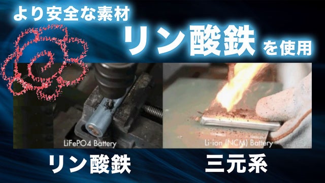 ポータブル電源に使用されるリチウムイオンバッテリ-には種類が何種類かありますが、今回採用したリン酸鉄は安全性が高く、電池内部での異常が起きても熱暴走による発火がしにくい電池です。以下の様に外部衝撃が加わった際も発火する事がありません。