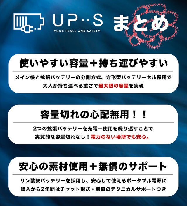 今回、緊急時に使用できないポータブル電源ではいけないと考え、日本企業として2年間の無償商品保証をつけさせていただきます。また、保証期間終了後も基本有償とはなりますが、サービスサポートは継続対応致します。