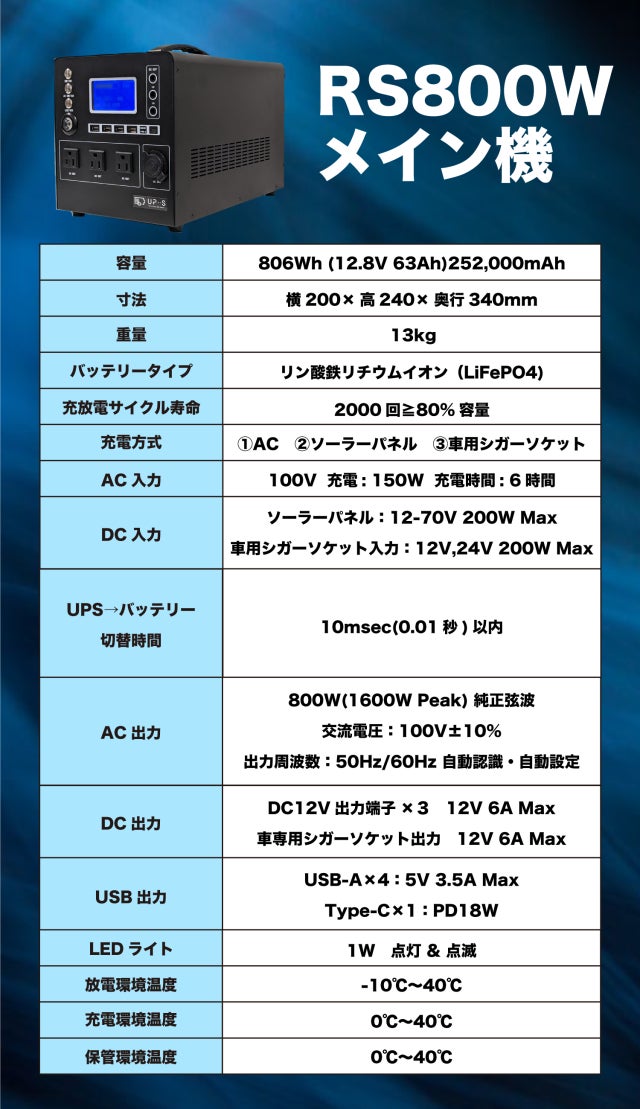 昨年秋、社内にこの3点を解消するポータブル電源プロジェクトを立ち上げ、RS800W 愛称UP‥S(ユーピース)の商品化を推進して参りました。