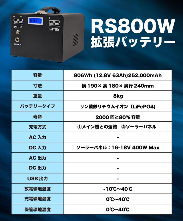 バッテリー容量は、メイン機、拡張バッテリー、それぞれ806Whとしました。RS800WのAC出力は800W・ピーク1600Wに対応します。小型ドライヤー、小型IHを含め、幅広い家電商品を使う事ができます。