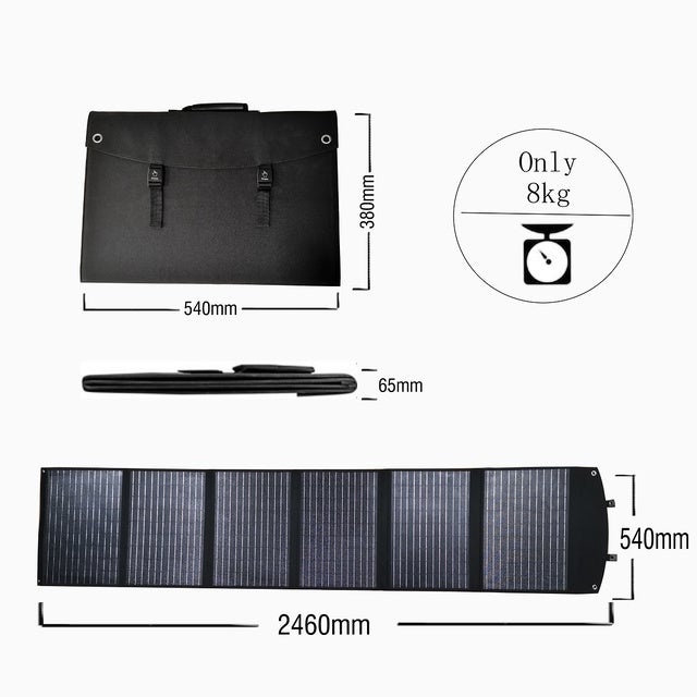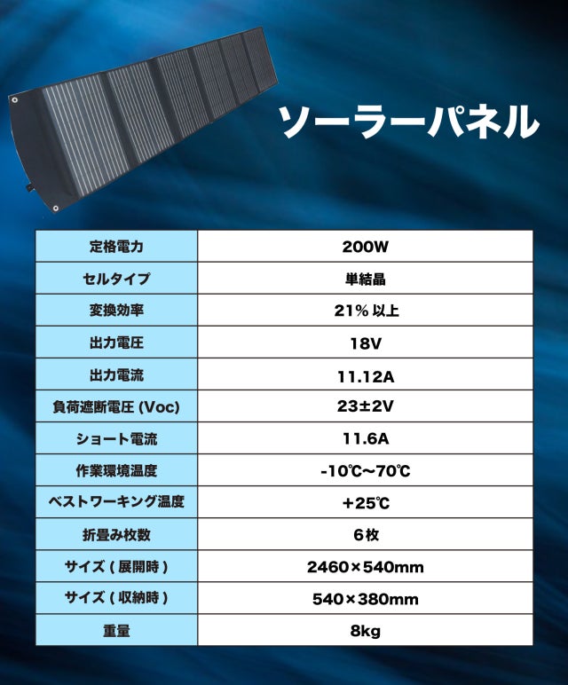 持運びしやすい、折畳み式のソーラーパネルです。最新の高出力、200Wタイプです。自立式スタンドも付いており、太陽に対し垂直になる様角度調整ができます。パネルからの出力端子はアンダーソンですが、アンダーソンからRS800W入力へ変換するケーブルは付属しています。