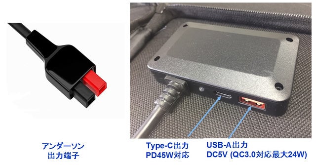 ソーラーパネル自身にUSB-A、Type-C出力端子を搭載しています。スマートフォン、タブレットなどをつないでパネルのみで充電する事もできます。