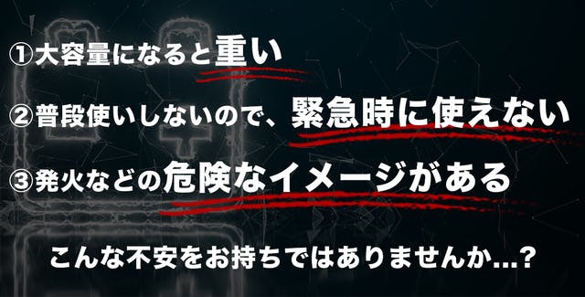 多くのお客様より、ご意見・ご要望をお聞きし、我々JBS社内で検討を行い、ポータブル電源に対する不満・不安を以下の3点に集約しました。