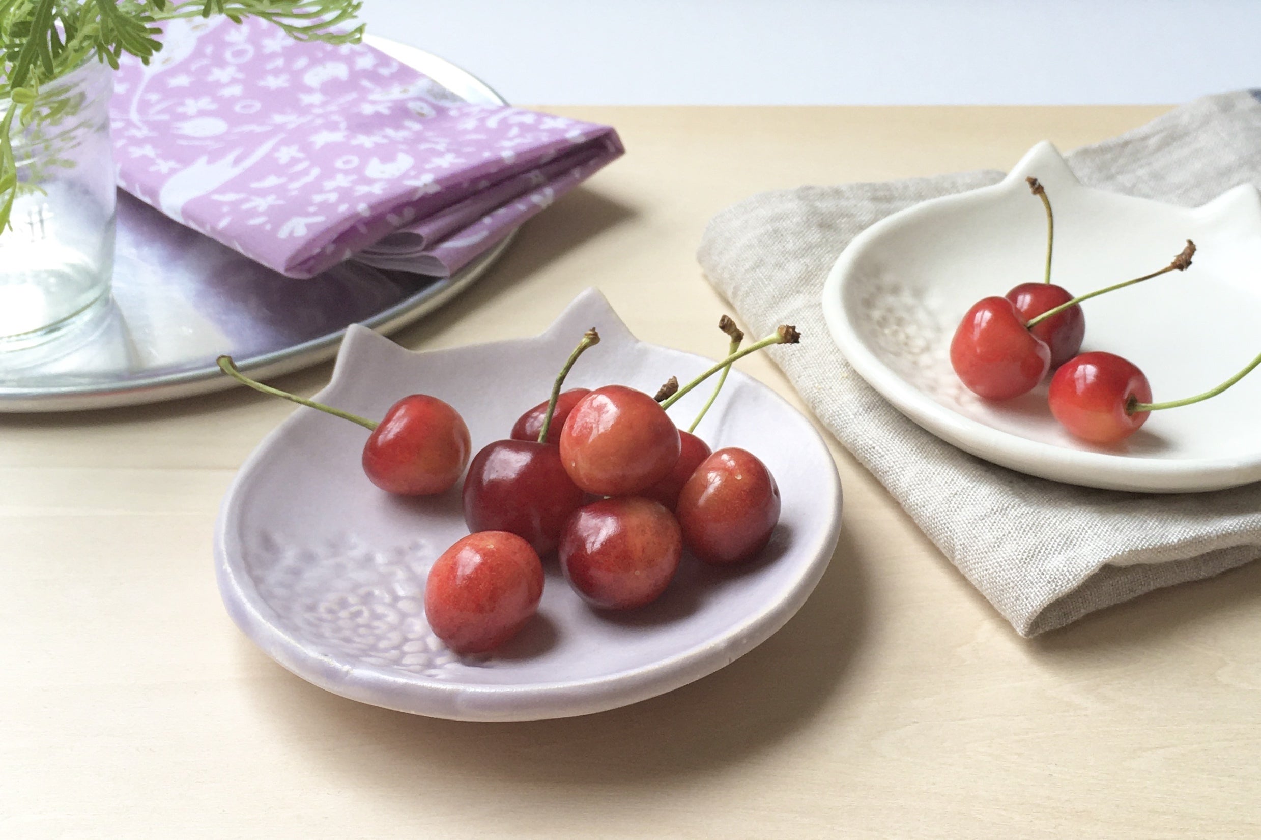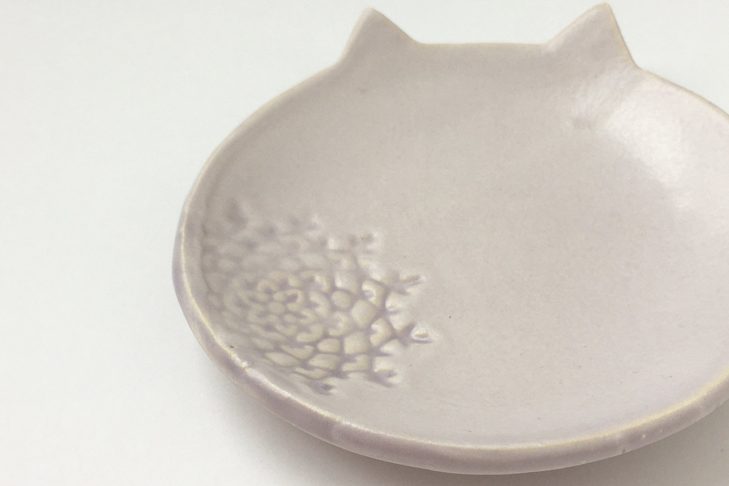 お皿には香りがありませんが、ぷっくり猫のシルエットと優しいラベンダーカラーで、楽しさや癒しを感じる器になりました。