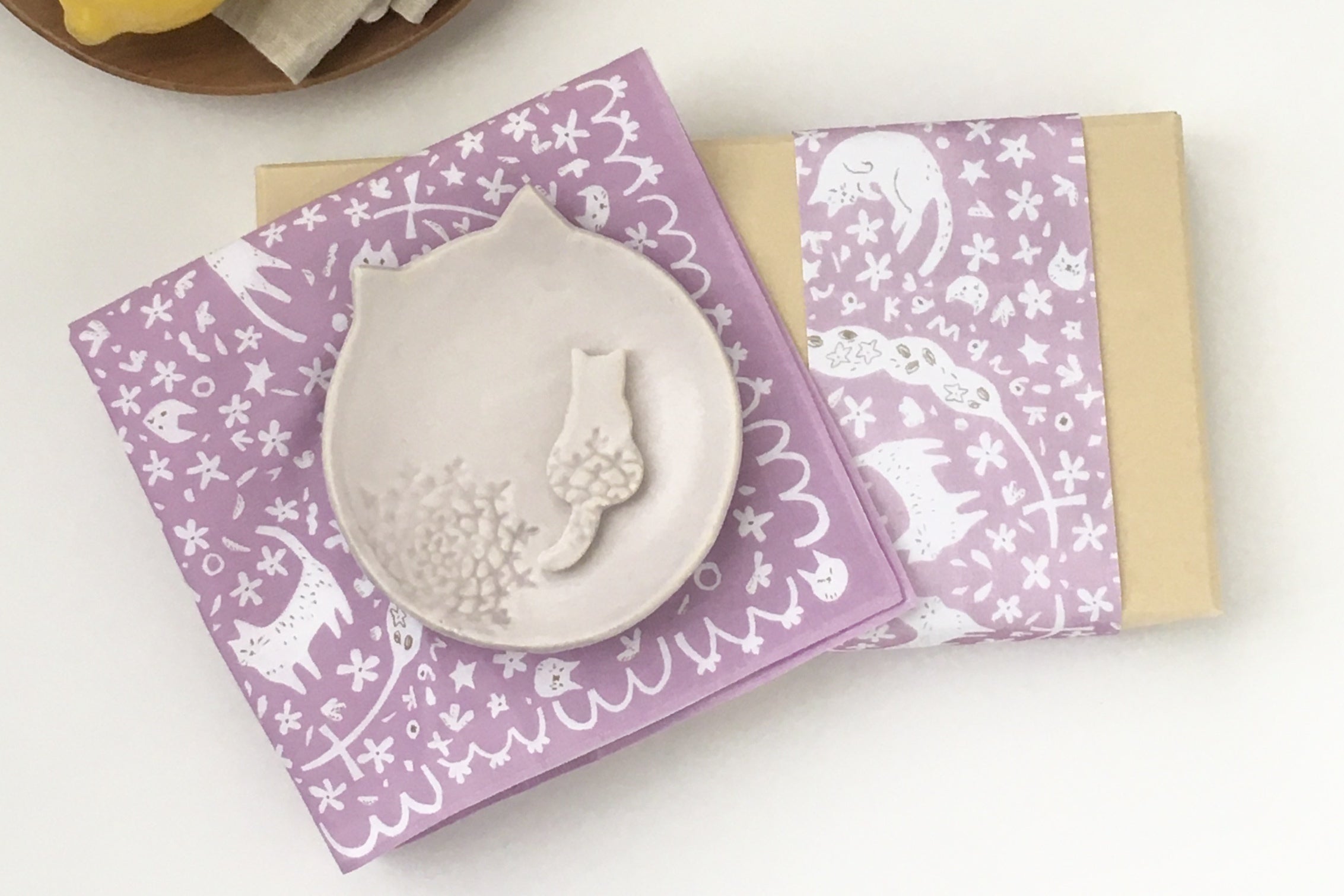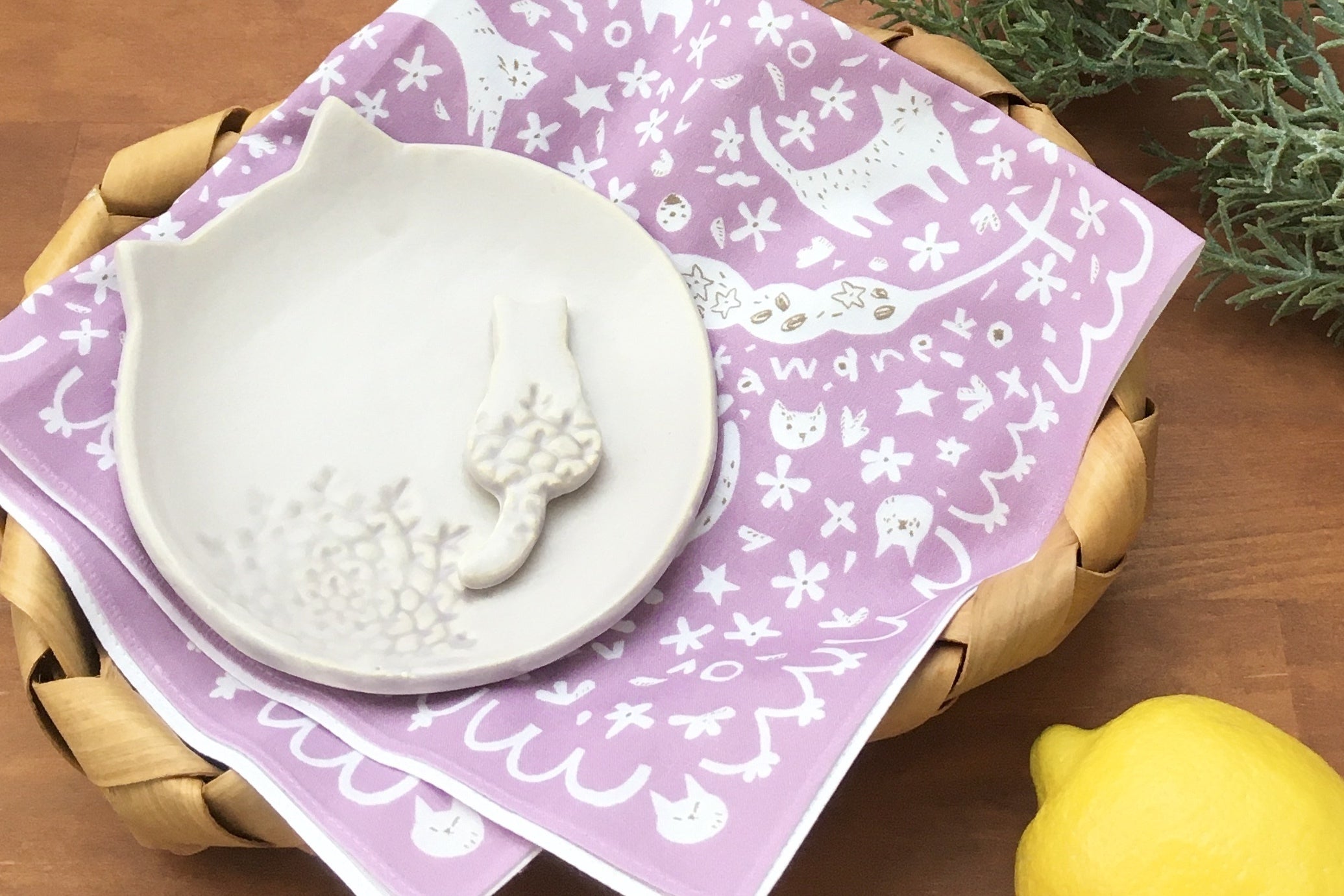 ラベンダー色の猫小皿のために、初めて制作したプリントハンカチです。