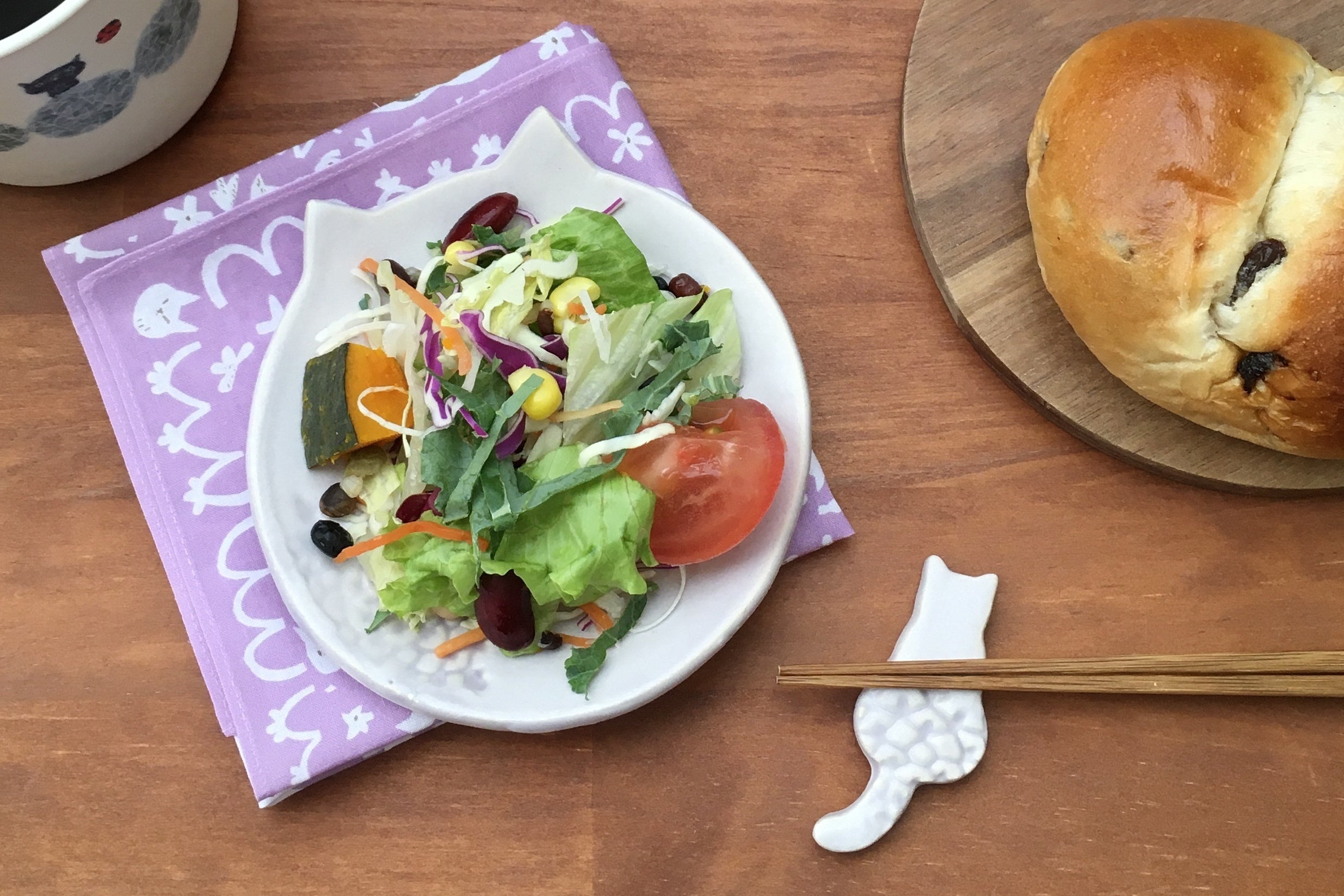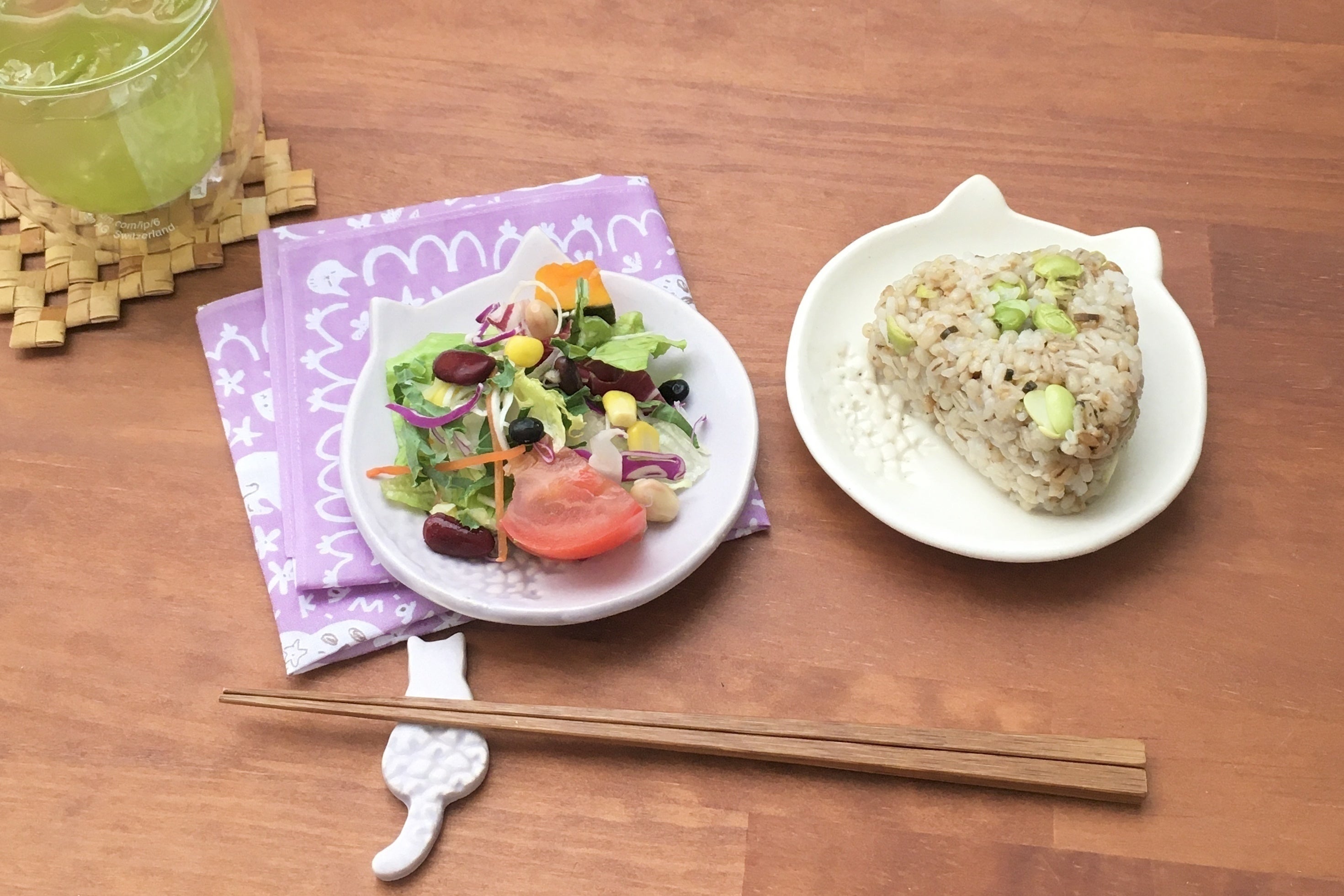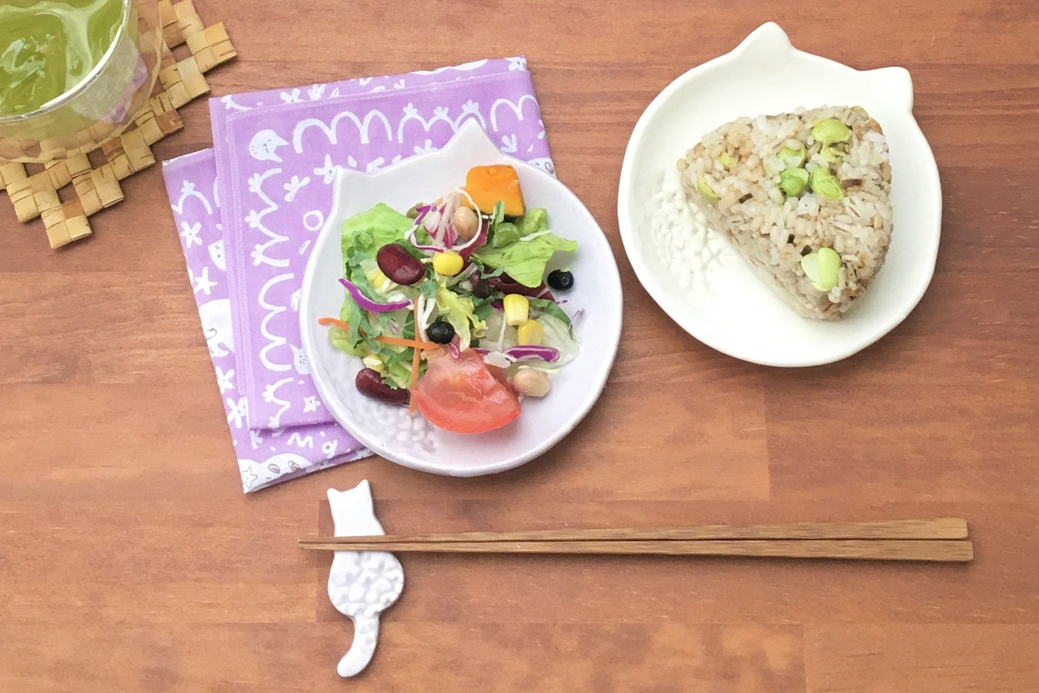2つの猫小皿で、おにぎりとサラダ。猫が並んだのんびり休日ブランチ。