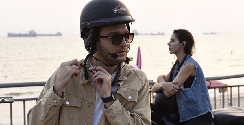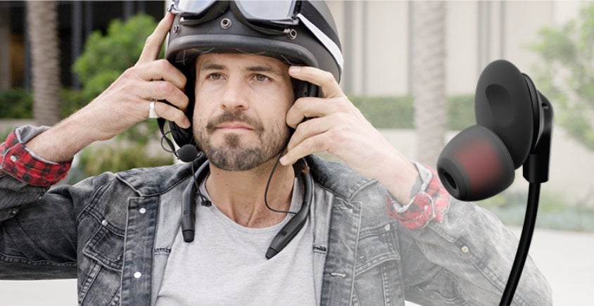 MPlusの使用方法はとても簡単。ヘルメットに装着するインカムのような、煩雑な取り付けは必要なし。