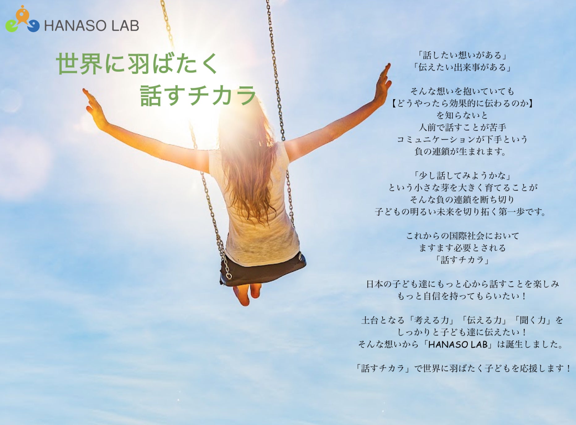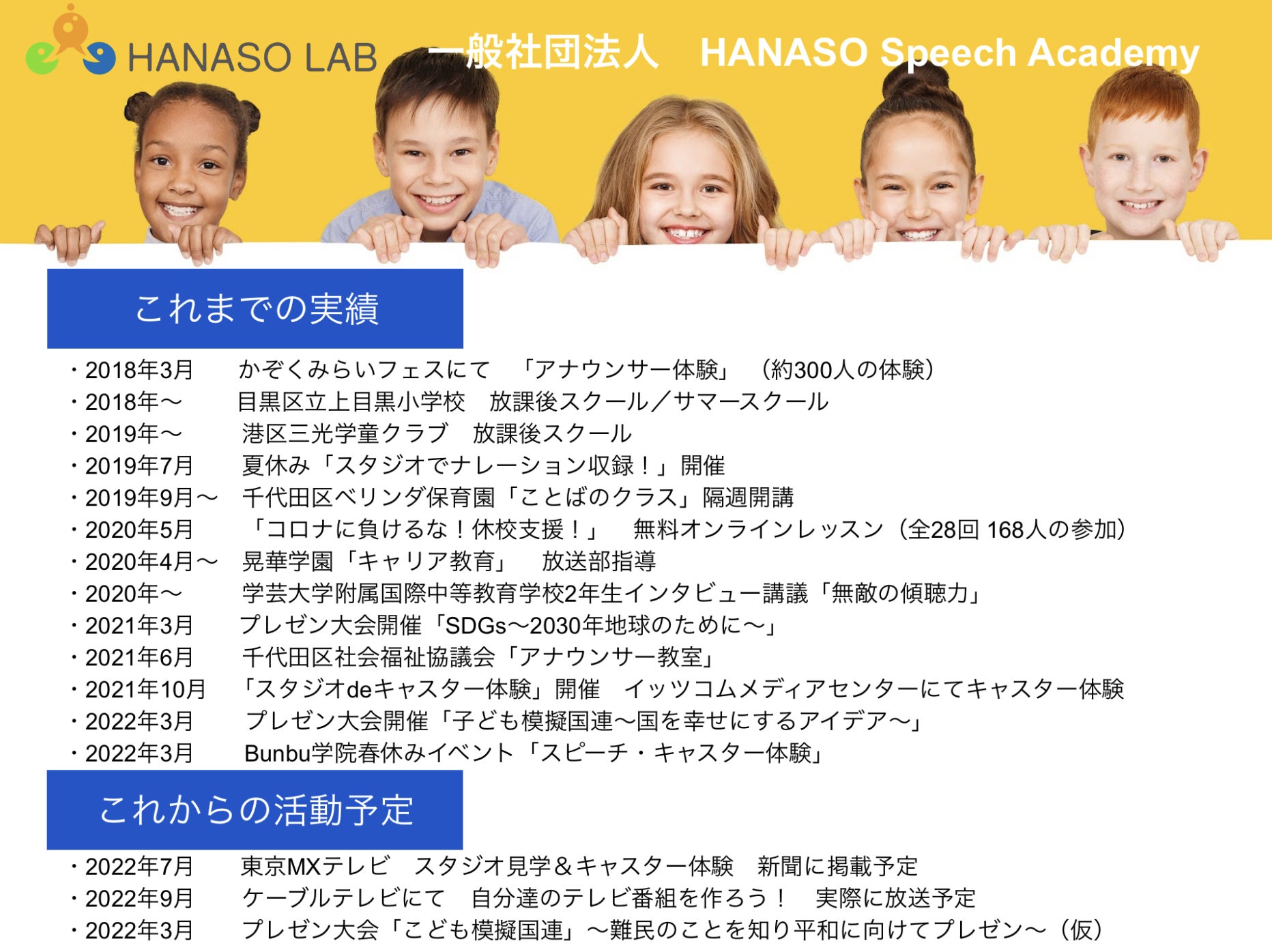 私たちはコロナ前の2019年から「日本の子どもたちの発表力をもっと高めたい」という理念のもとHANASO LABというスピーチ教室を運営しているママアナウンサーの団体です。
