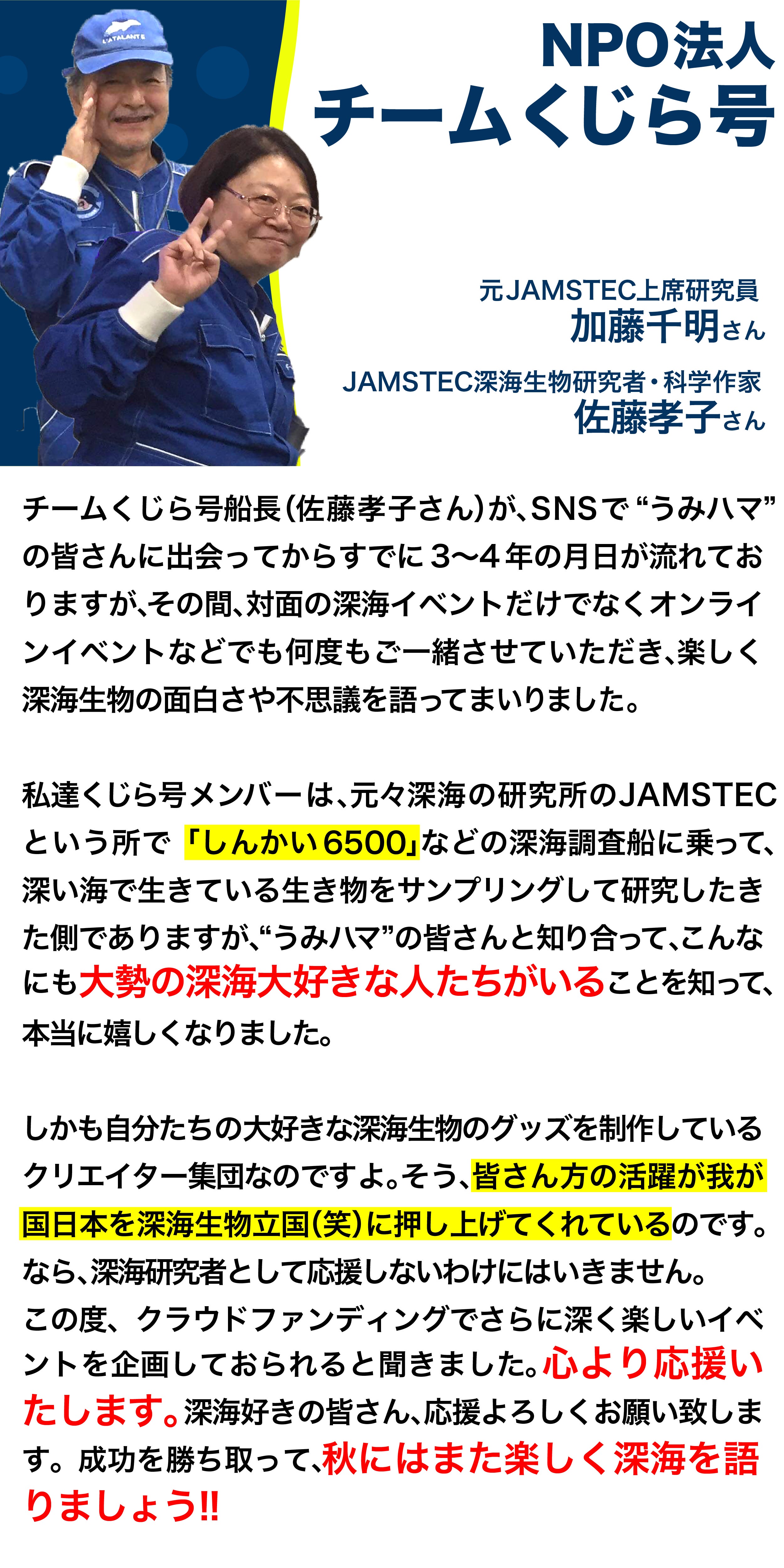 「うみハマVol.3」では、支援金額が第1目標金額を達成したら、チームくじら号代表である農学博士・深海微生物研究者・バイオテクノロジーの加藤千明さんと、副代表である博士(理学)・科学作家の佐藤孝子さんによる深海と深海生物にまつわるトークイベントを開催します。