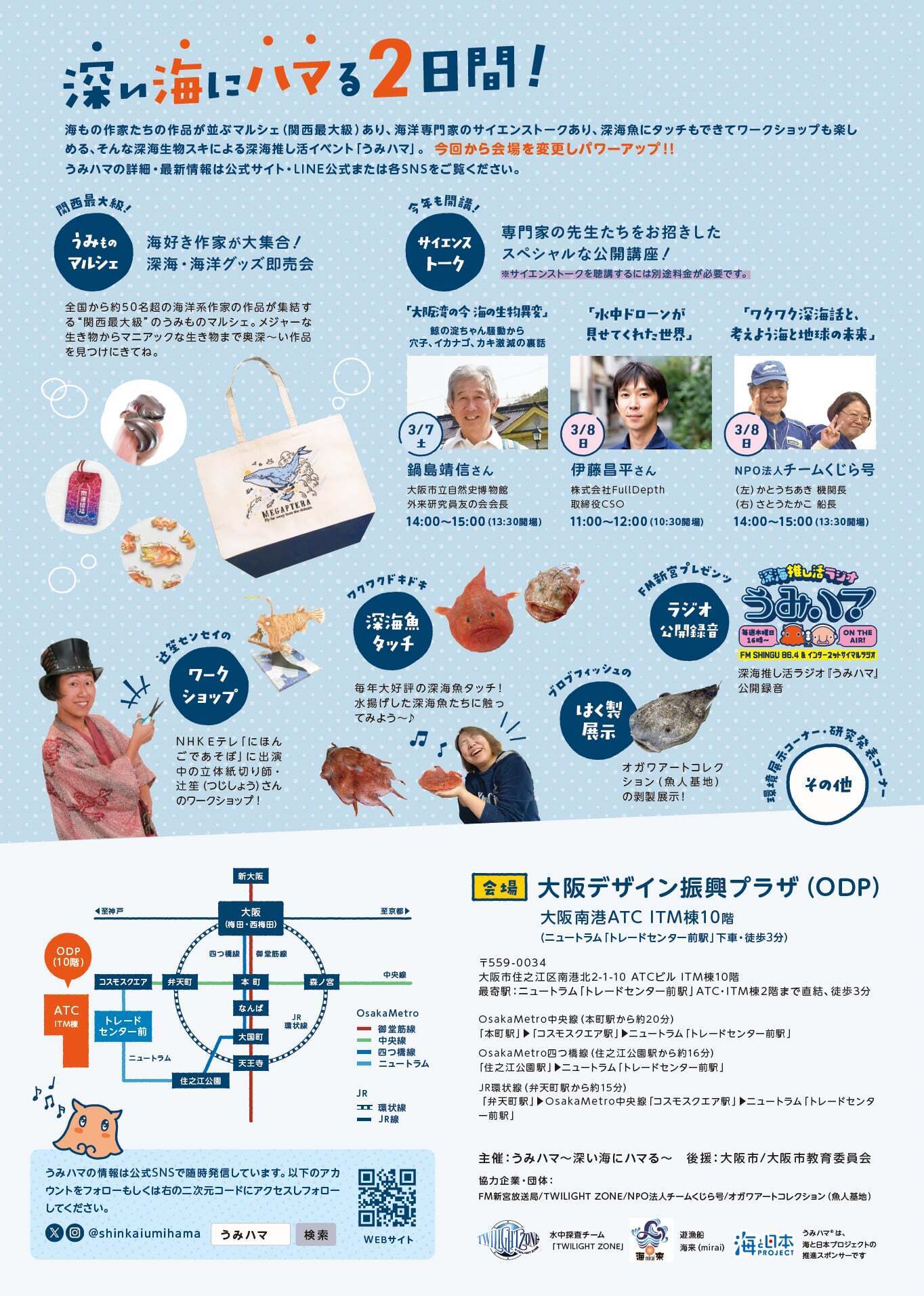 2026/02/04 18:30うみハマvol.5開催まで残り1ヶ月と少し‼現在、うみハマvol.5をお得に楽しめる、早割チケットを発売中‼◯入場当日券1100円→早割だと880円‼◯サイエンストーク当日券1320円→早割だと880円‼※上記はカウンター購入価格※当日でもWEBチケットなら、入場券990円、サイエンストーク1100円▶︎チケット販売サイトはこちらhttps://livepocket.jp/e/umihama5今年のうみハマvol.5は…★大阪湾から深海まで‼サイエンストークで海を知ろう‼◯3/7 14時〜15時(開場13時30分)開催『大阪湾の今 海の生物異変』大阪市立自然史博物館外来研究員友の会会長 鍋島靖信さん鯨の淀ちゃん騒動から穴子、イカナゴ、カキ激減の裏話をお聞きします!大阪湾の生き字引‼大阪湾といえば鍋島さん‼まだ記憶に新しい、マッコウクジラの淀ちゃんのお話…当時、様々な報道をされていました。鍋島さんが見た、淀ちゃんの顛末とは?!その他、大阪湾の知られざる現状など、身近なのに全然知らない、驚きと発見のサイエンストークをお届けします!◯3/8 11時〜12時(開場10時30分)『水中ドローンが見せてくれた世界』株式会社FullDepth 取締役CSO 伊藤昌平さんー子どもの頃から深海魚が大好き。中でも図鑑で見たナガヅエエソに惹かれ「いつか、この目で見てみたい」という夢を抱く。やがて大学で専攻したロボット工学を活かし、夢を叶えるためにロボット受託開発会社、株式会社FullDepth(フルデプス)を設立。国産で唯一、深海まで潜水して撮影できる産業用ロボット(水中ドローン)を完成させた。ー水中ドローンで撮影した貴重な深海映像と共に、伊藤さんが見てきたいろんな深海のお話は必聴です!◯3/8 14時〜15時(13時30分開場)『ワクワク深海話と、考えよう海と地球の未来』NPO法人チームくじら号うみハマと言えば、チームくじら号のサイエンストーク‼友人潜水調査船「しんかい6500」で深海調査してきた、かとう ちあき機関長とさとう たかこ船長による、深海のお話。前半は船長を中心に、映像を交えながら、思わず引き込まれる“ワクワク深海話”をお届けします。後半は機関長が中心となり、深海から見た「海と地球の未来」についてお話しします!過去最高の3組のゲストをお迎えして実施するサイエンストーク。どのトークも、海を知る絶好の機会になること間違いなし‼ぜひ、お得な早割チケットをゲットしてご参加くださいね〜‼▶︎チケット販売サイトはこちらhttps://livepocket.jp/e/umihama5 もっと見る