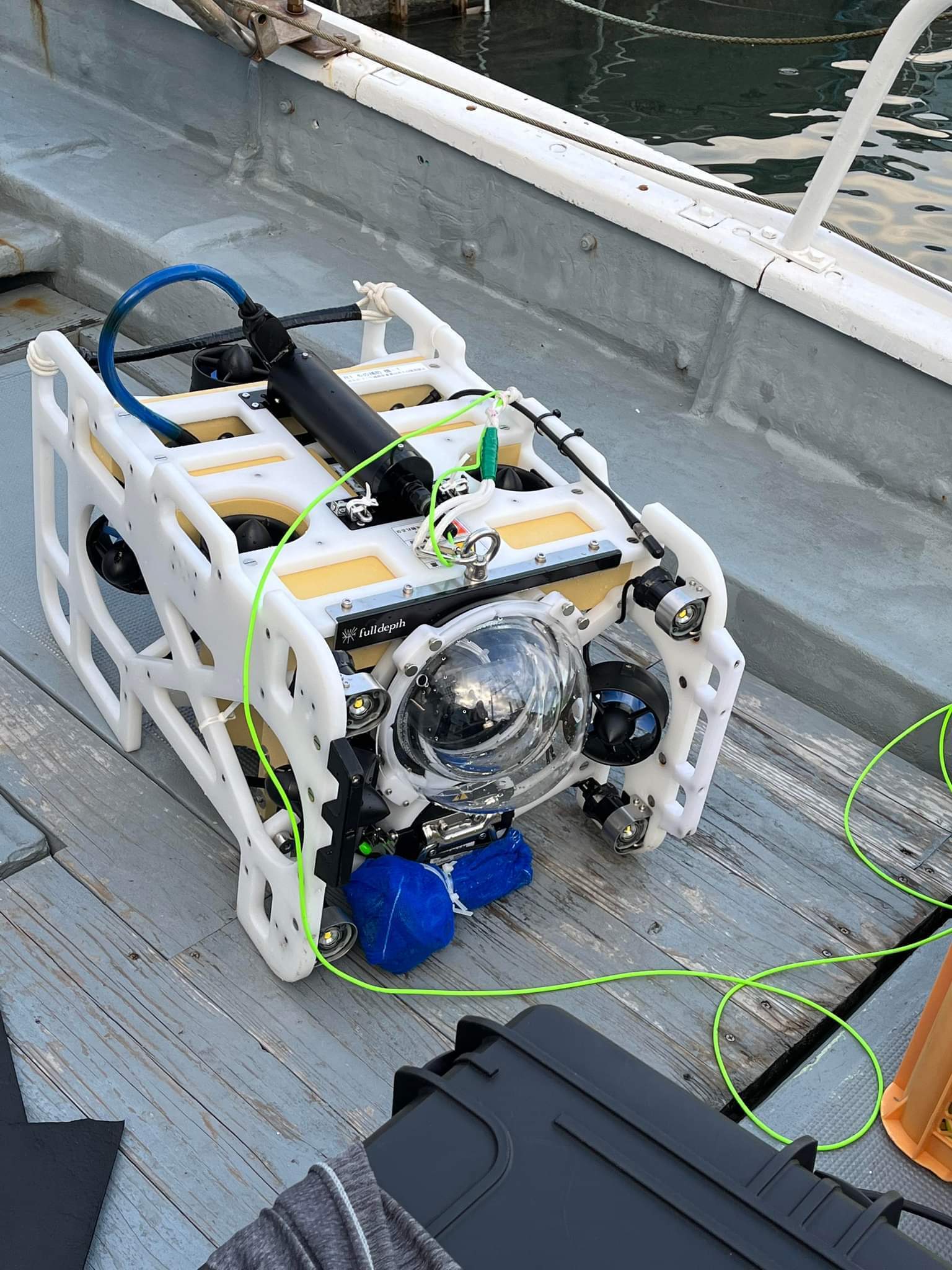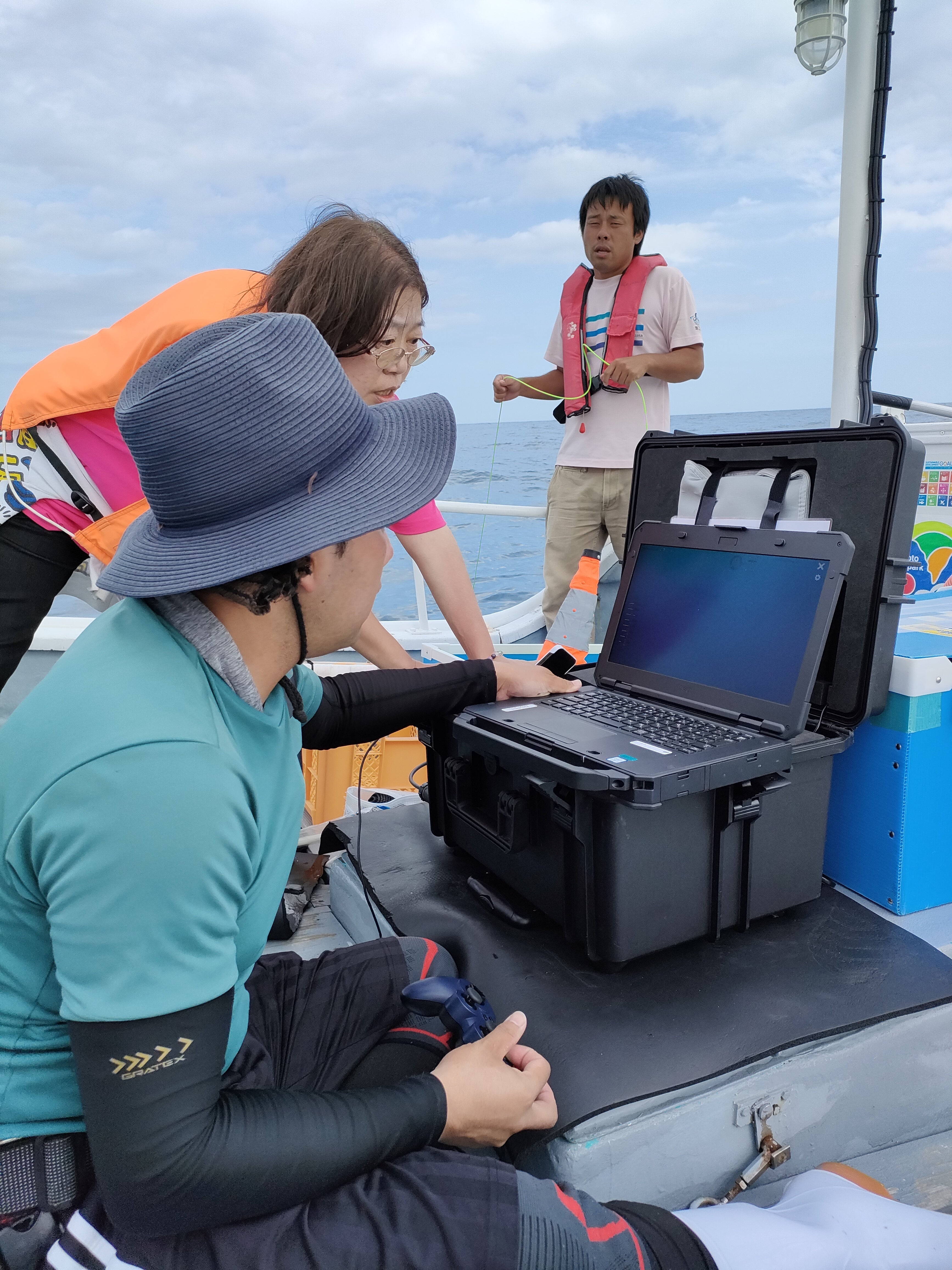 漁船に乗って、船の上から水中ドローン搭載カメラで深海を調査します。