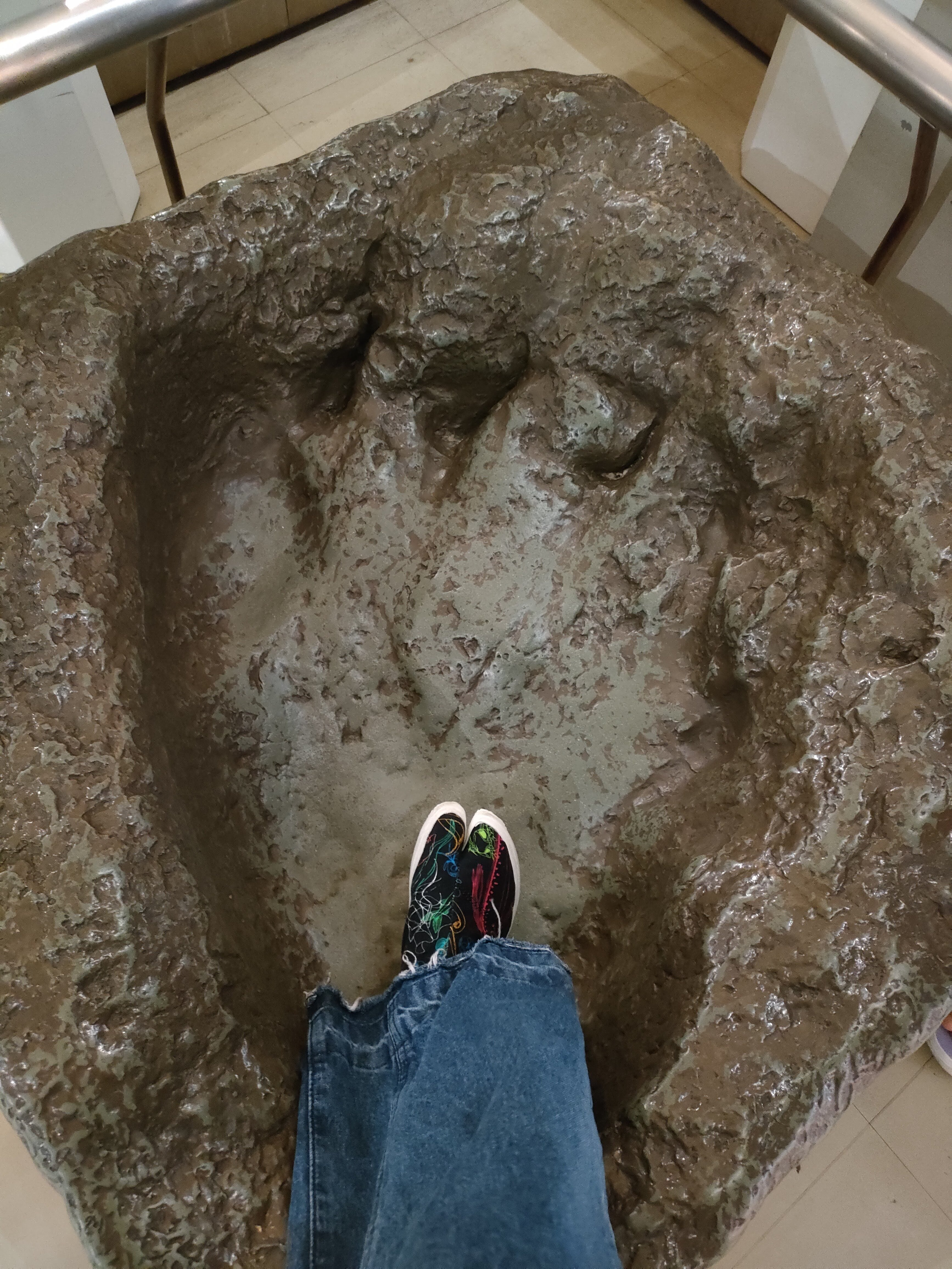 写真は、常設展にある恐竜の足形と自分の足のサイズの比較。恐竜の足大きい!