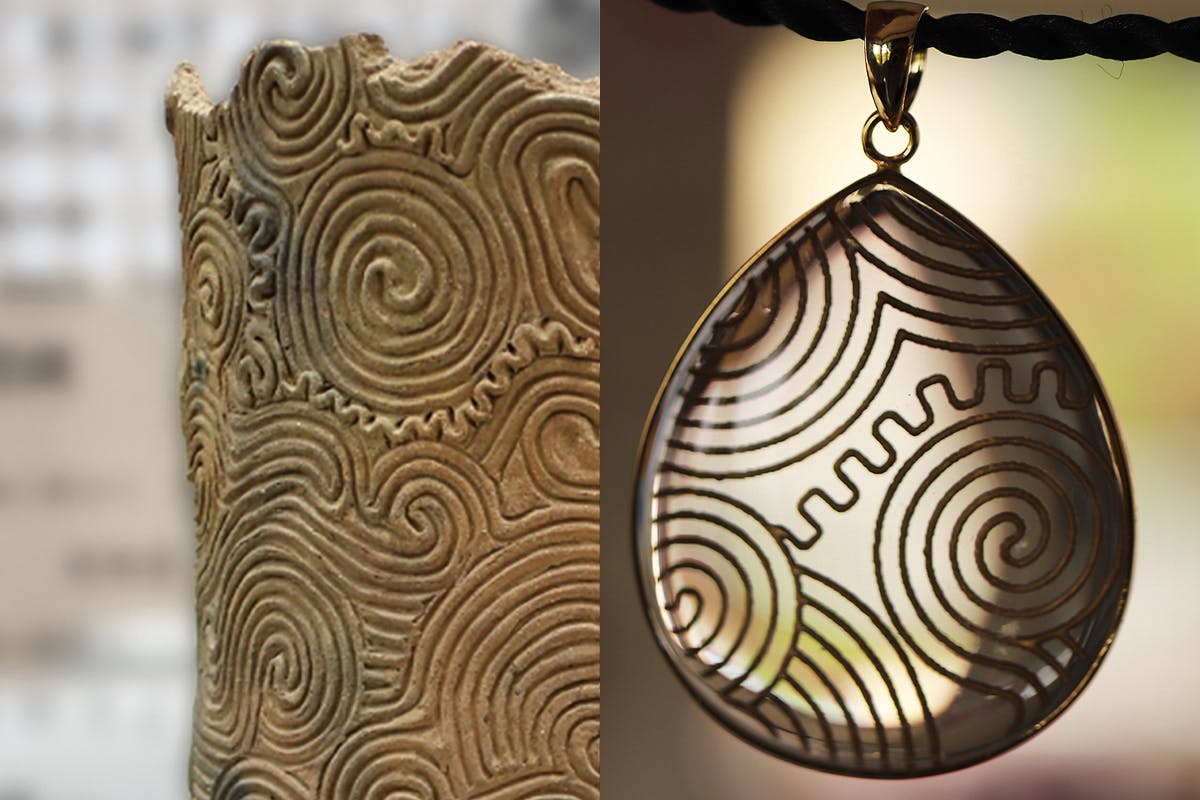 プロジェクト第3弾!は縄文時代の土器に描かれている文様を切り取ったような水晶のペンダントをご紹介させていただきます。縄文土器の文様はとても美しいですよ!
