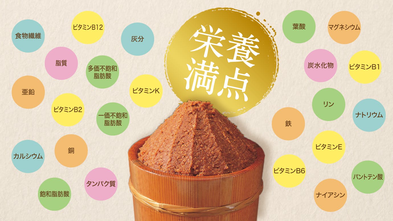 味噌には、必須アミノ酸・ビタミン類をはじめ、カリウム・カルシウム・マグネシウム・鉄分・食物繊維など、非常に豊富な栄養成分が含まれています。