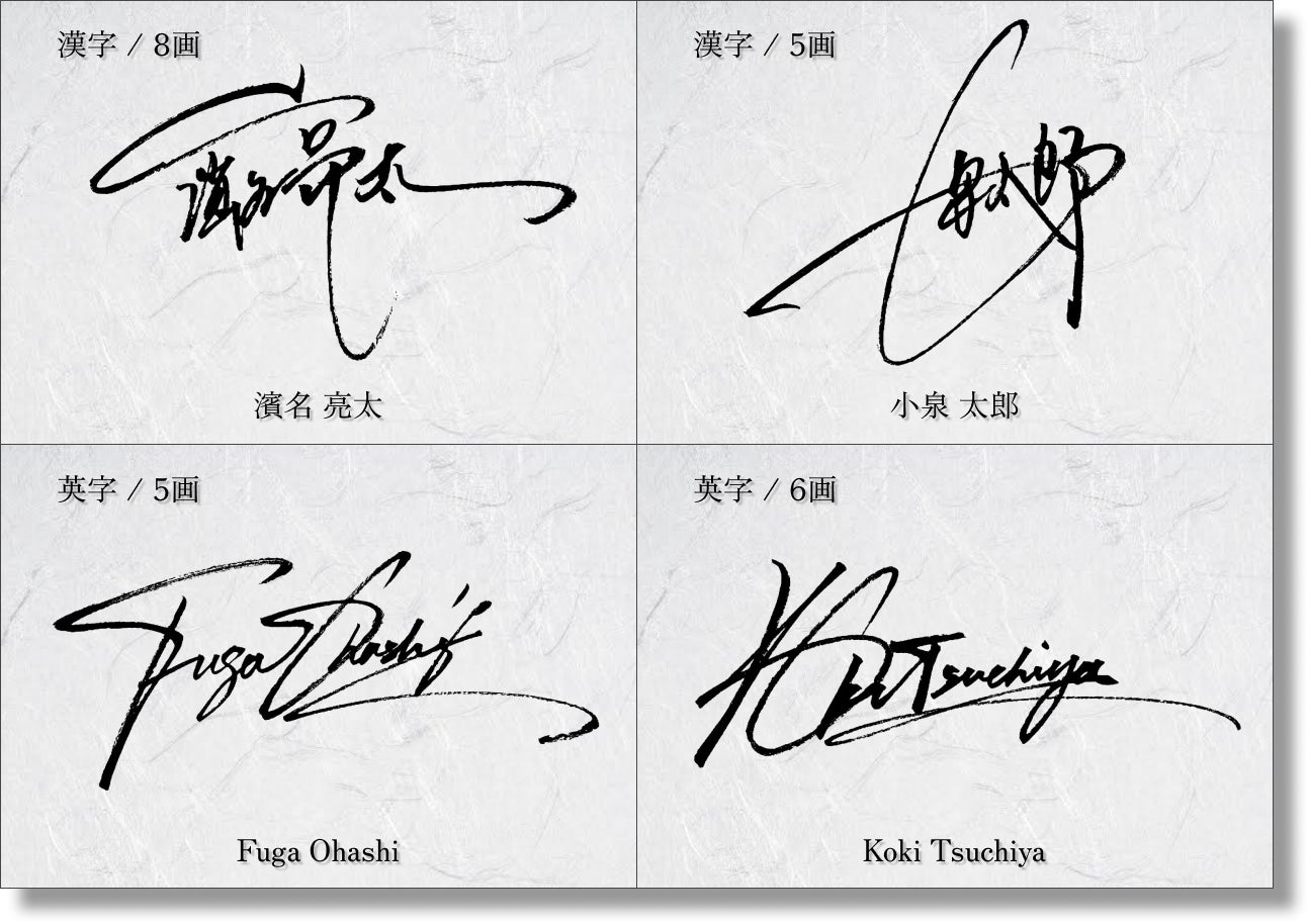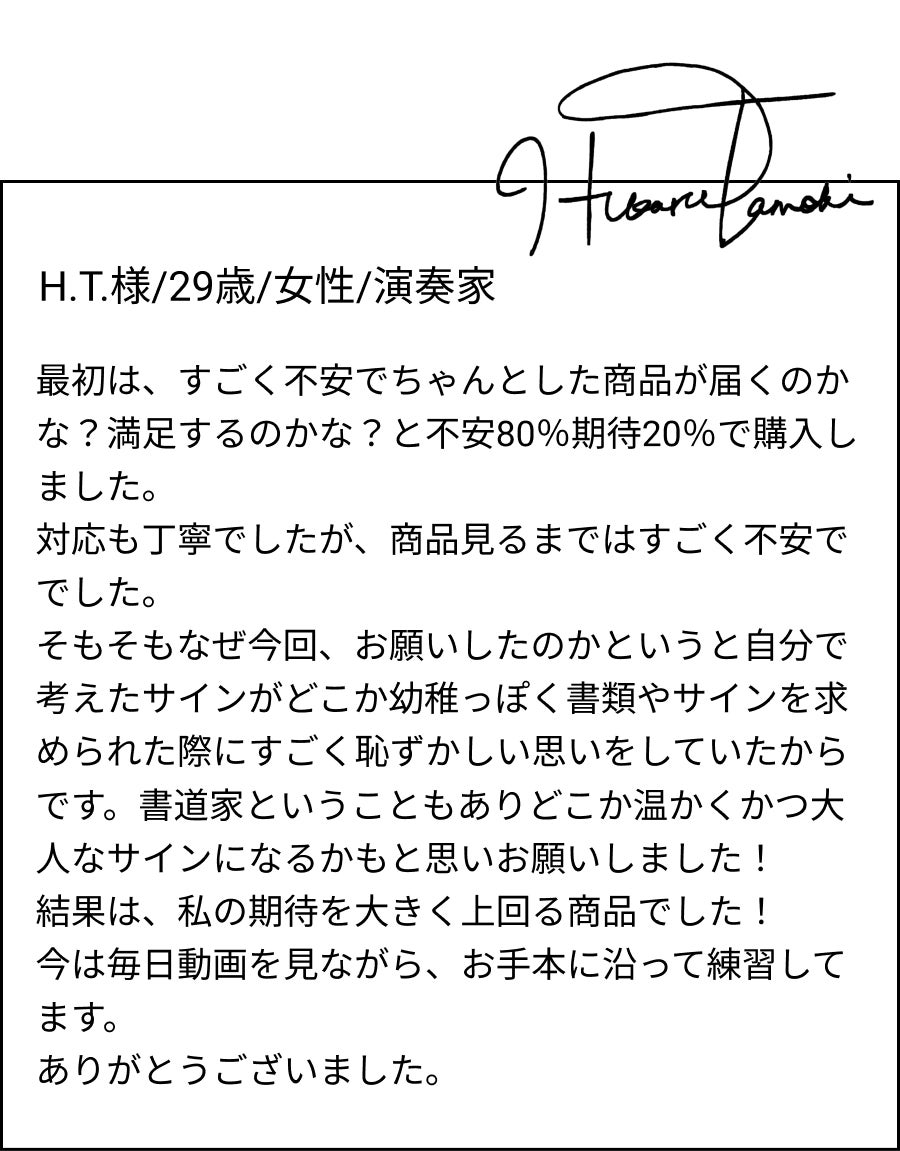 追加料金¥10,000 をお支払いいただくことで、ご納品させていただくオリジナルサインを「筆文字Ver.」に変更できます。 こちらは「とめ・はね・はらい」などが通常のサインよりも強調されるため、書道家の本領が発揮されるオプションとなります。 通常のプランでご納品させていただくボールペンで書いたサインとは一線を画す深みのある仕上がりが特徴です。