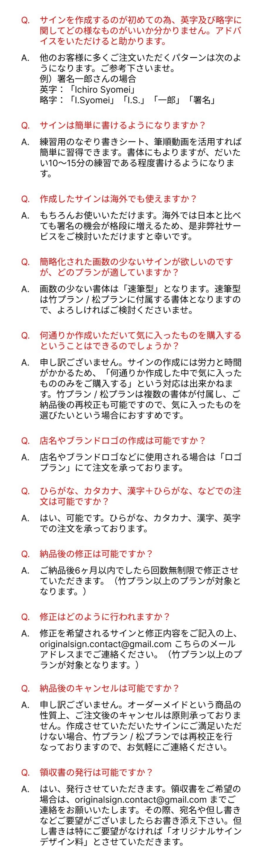 心からご満足いただける、「一生もののオリジナルサイン」としてご提供させていただくため、購入後6ヶ月間は回数無制限の修正対応を行なっております。(※蕾/梅プランは対象外となります。)