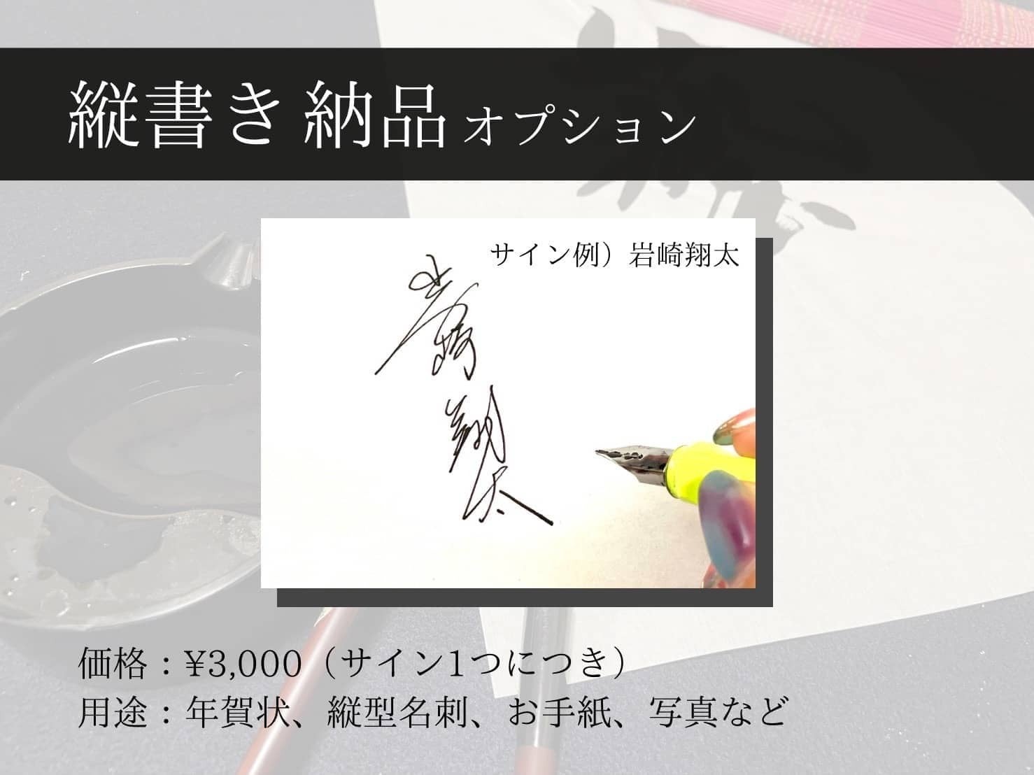 通常、オリジナルサインは横書きのものを作成させていただいておりますが、「縦書きのサインも欲しい!」というお声をたくさんいただいたため、今回特別に縦書きのオリジナルサインも作成させていただきます。サイン1つにつき3,000円でオプションをご用意しておりますので、年賀状や縦型名刺など幅広く活用できる「縦書きサイン」も是非ご検討ください。