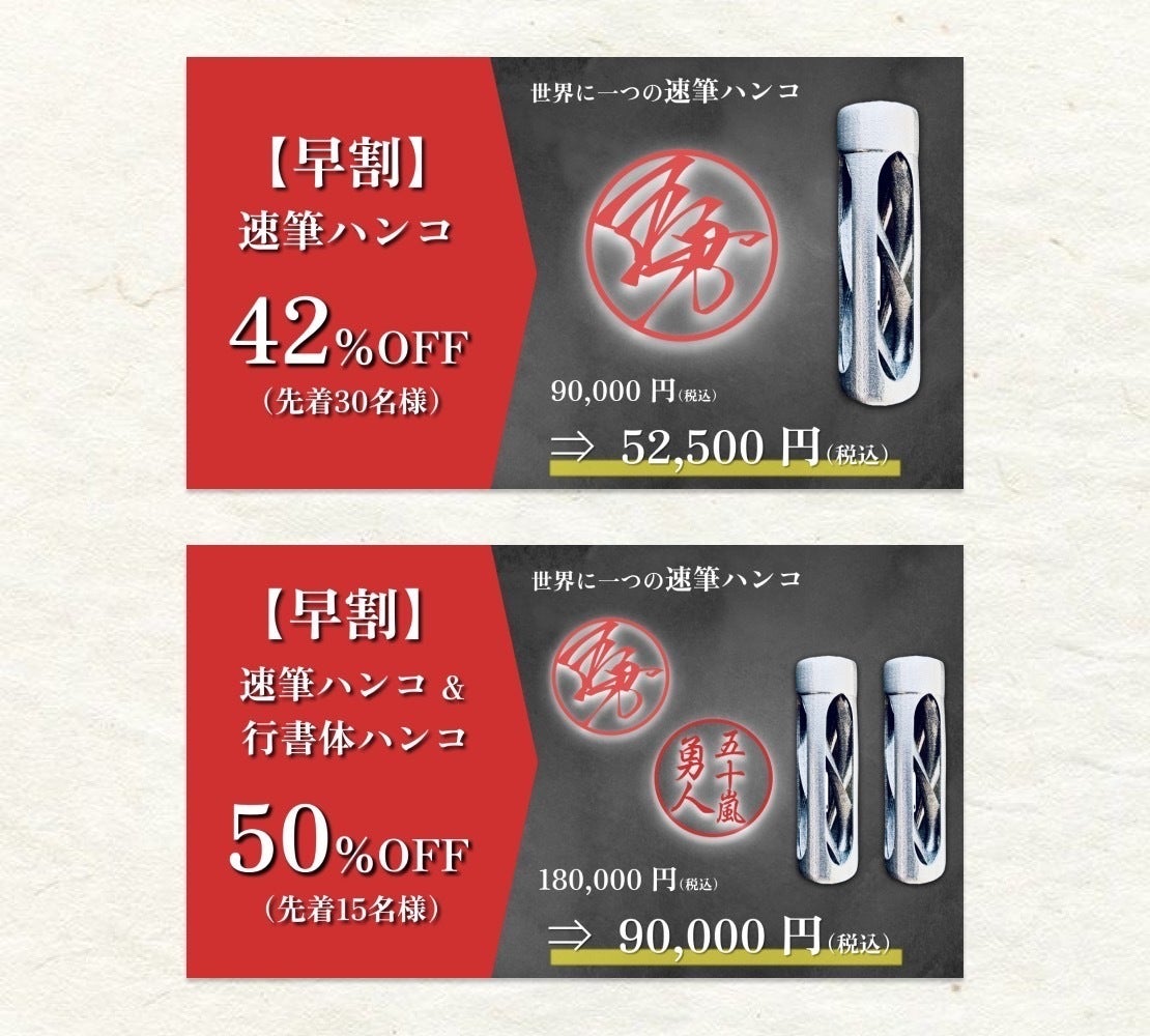 2024/09/30 20:084時間後、自動的に開始3日間限定の早割キャンペーンが終了します!速筆サインの作成を担当しております書道家の祖父江望実です。皆さま、お得に購入できる・早割 速筆ハンコ(42%OFF)・早割 速筆ハンコ & 行書体ハンコ(50%OFF)はご注文いただけましたでしょうか?こちらはプロジェクト開始から3日間の限定販売となっており、本日23:59に販売を終了致します!「今はそれほど重要な予定はないから必要ない」と考える方もいるかもしれませんが、人生を左右するような選択が突然訪れないとも言い切れないので、早めに準備しておくのに越したことはありません!明日以降も「Makuake割」は注文を受け付けておりますが、お得に購入できる『早割』はあと4時間で販売終了となりますので、ご注文をご検討されている方は、是非 本日中にご注文くださいませ。【速筆ハンコのご注文はこちら】https://www.makuake.com/project/calligrapher_signature_04/___________________________【 速筆ハンコの特徴1 】書道家が創るあなただけのオリジナルサインを印影に使用「速筆サイン」でこれまでに7,000名を超える方のサイン作成実績を持つ書道家・祖父江望実が創る、世界に一つのサインを印影に使用します。新しく登場した『行書体ハンコ』は認印/銀行印/実印と幅広くご使用可能です!【 速筆ハンコの特徴2 】究極の曲線美。サグラダ・ファミリアにインスパイアされた“螺旋構造”を採用美の骨頂「サグラダ・ファミリア」の曲線美を参考に、螺旋の方程式 r = (x, y, z) = (acosθ, asinθ, bθ) に基づいて設計された螺旋構造を持ち手部分に採用した美しく洗練されたフォルムが特徴です。【 速筆ハンコの特徴3 】手に馴染んで使いやすい、金属特有の“重厚感”金属が放つ美しい光沢と金属特有の重厚感で、かつてないほど贅沢で洗練された印鑑が完成しました! もっと見る