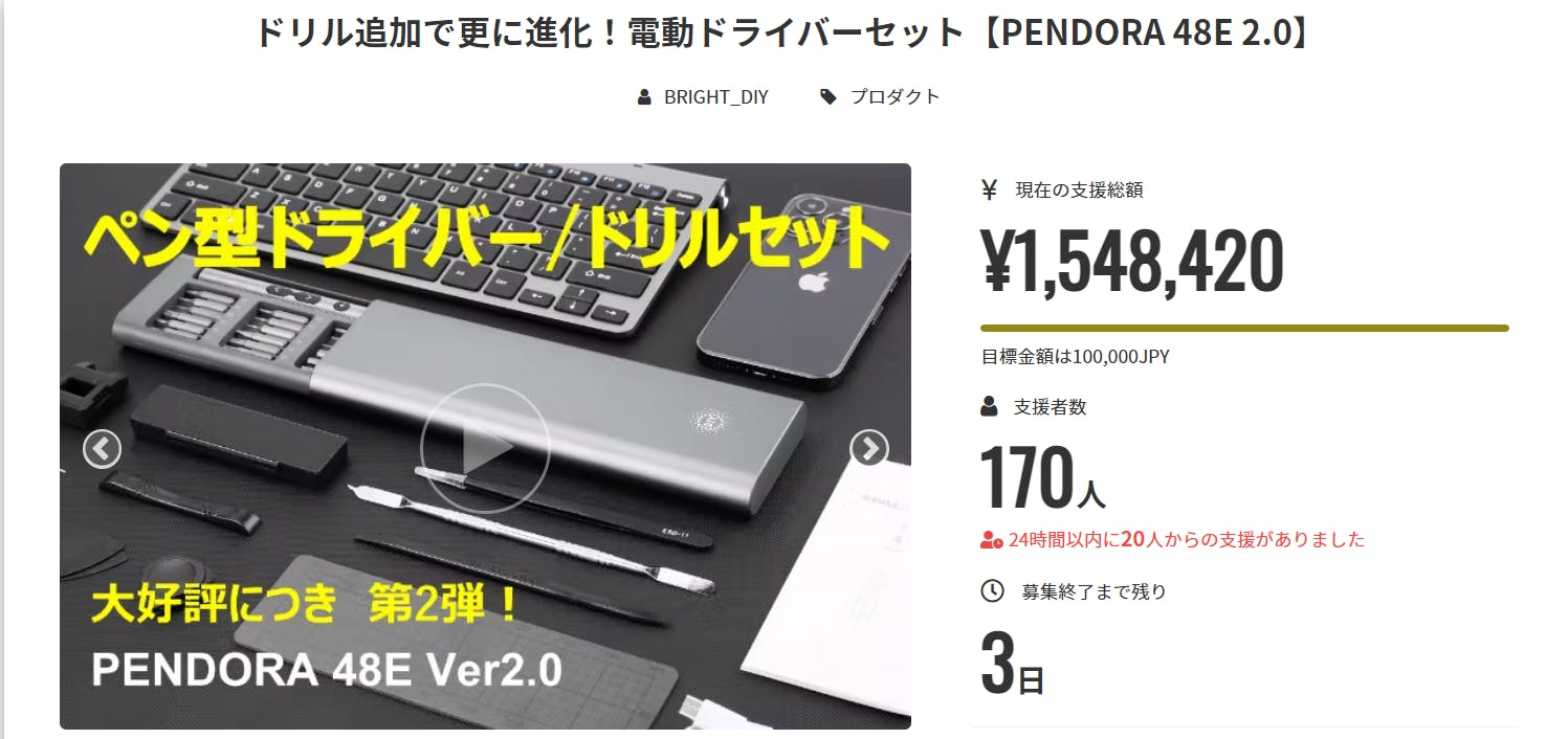 この度は「ドリル追加で更に進化!電動ドライバーセット【PENDORA 48E 2.0】」にご支援頂き誠にありがとうございます!