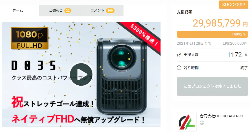 最も成功したのは3000万円近い額を集め、支援者様の力でアップグレードされたD035スマートプロジェクターです。