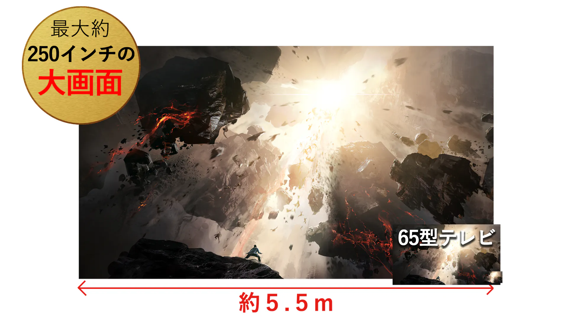 X3Aはハイエンドモデルでも100インチまでが限界のプロジェクターが多い中で、最大250インチ(ヨコ約5.5m、タテ約3.1m)のサイズに投影可能!