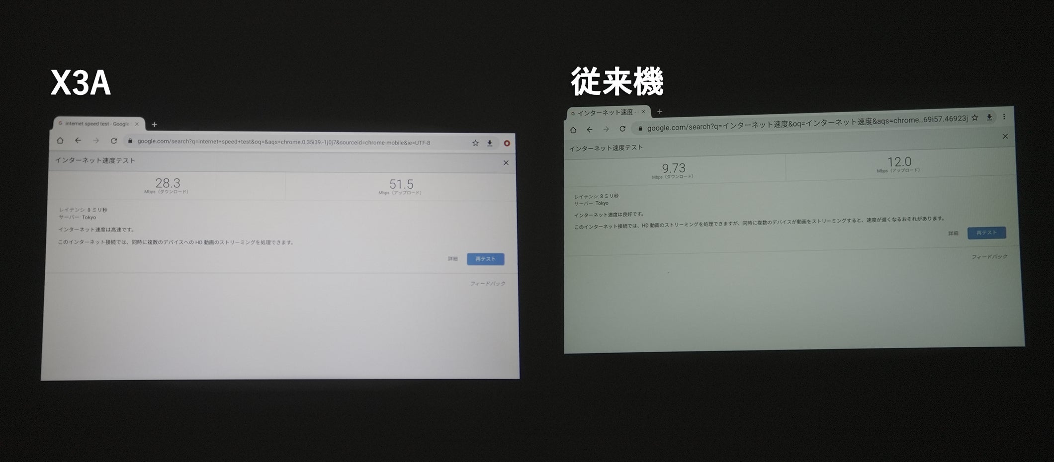 X3Aは従来機と比べて上りも下りも約3倍以上の速度が出ており、この速度がアプリでの動画視聴の安定性、動画の読み込み速度など視聴の快適性を支えています!