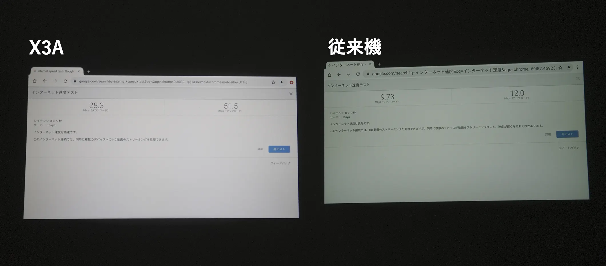 完全同一のWifi、同一の環境下で従来機とインターネット速度を比較しました。