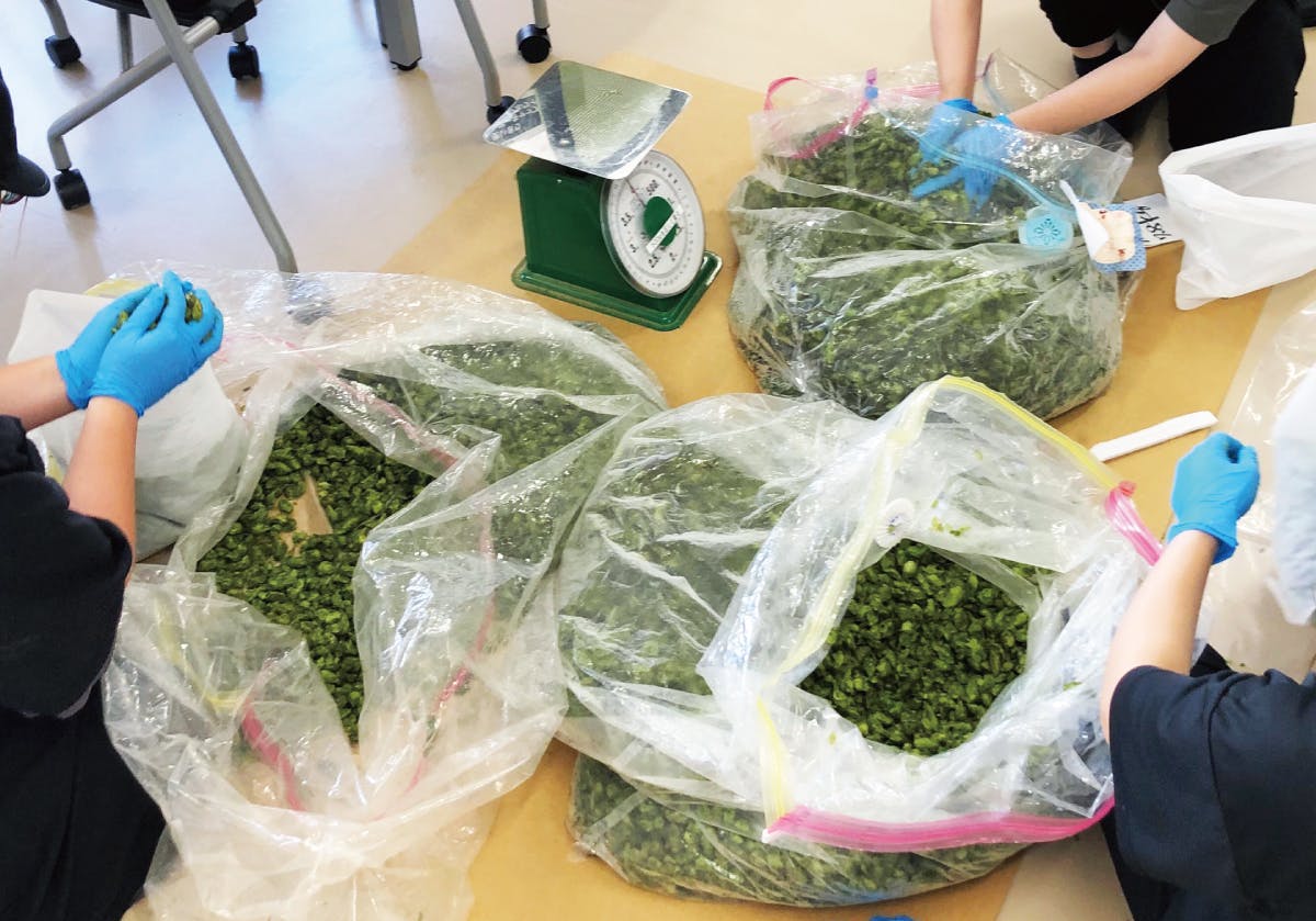 雫石工場2階から見えるしずくいしホップチャレンジの畑で収穫したホップを優しく、優しく揉みほぐしています♪