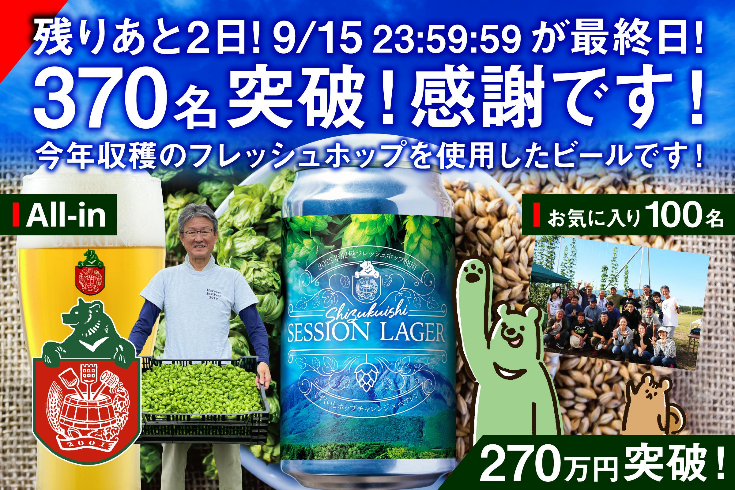 ご支援者370名さま!お気に入り100名!270万円突破!