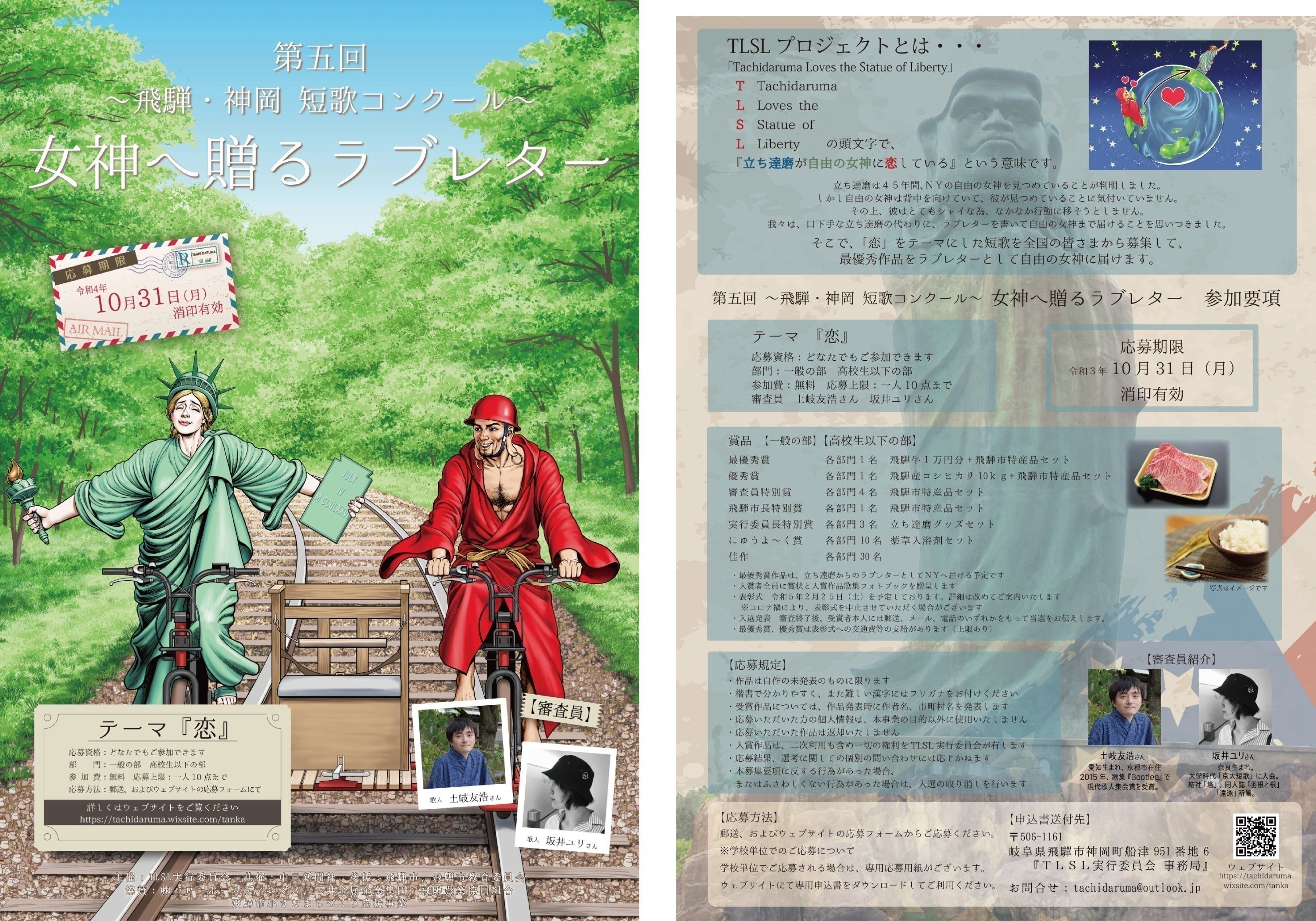口下手な立ち達磨の代わりに、全国から「恋」の短歌を募集して、最優秀賞作品を立ち達磨からのラブレターとして自由の女神へ贈ろうと、飛騨・神岡短歌コンクール『女神へ贈るラブレター』を開催しています。