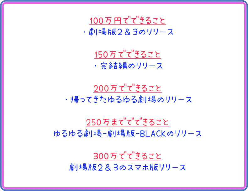 目標額まで遠いので、明確に金額によってできることを示したいと思います。