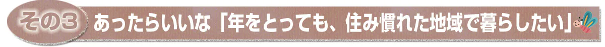 その中で「好きな食べ物を食べ、好きなことをして、好きなところへ行きたい」「足腰が弱っても、誰かに助けてもらって家で暮らしたい」「できないことが増えても、人の役にたちたい」「友達や家族から邪魔にされず、話を聞いてくれる人がほしい」といった多くの声が聞かれました。この声から、気軽に集まり、食事やおしゃべりをしたり好きなことを楽しむ高齢者のたまり場「憩いの家」が誕生し、介護保険制度が始まってからはデイサービスの事業所もつくられてきました。