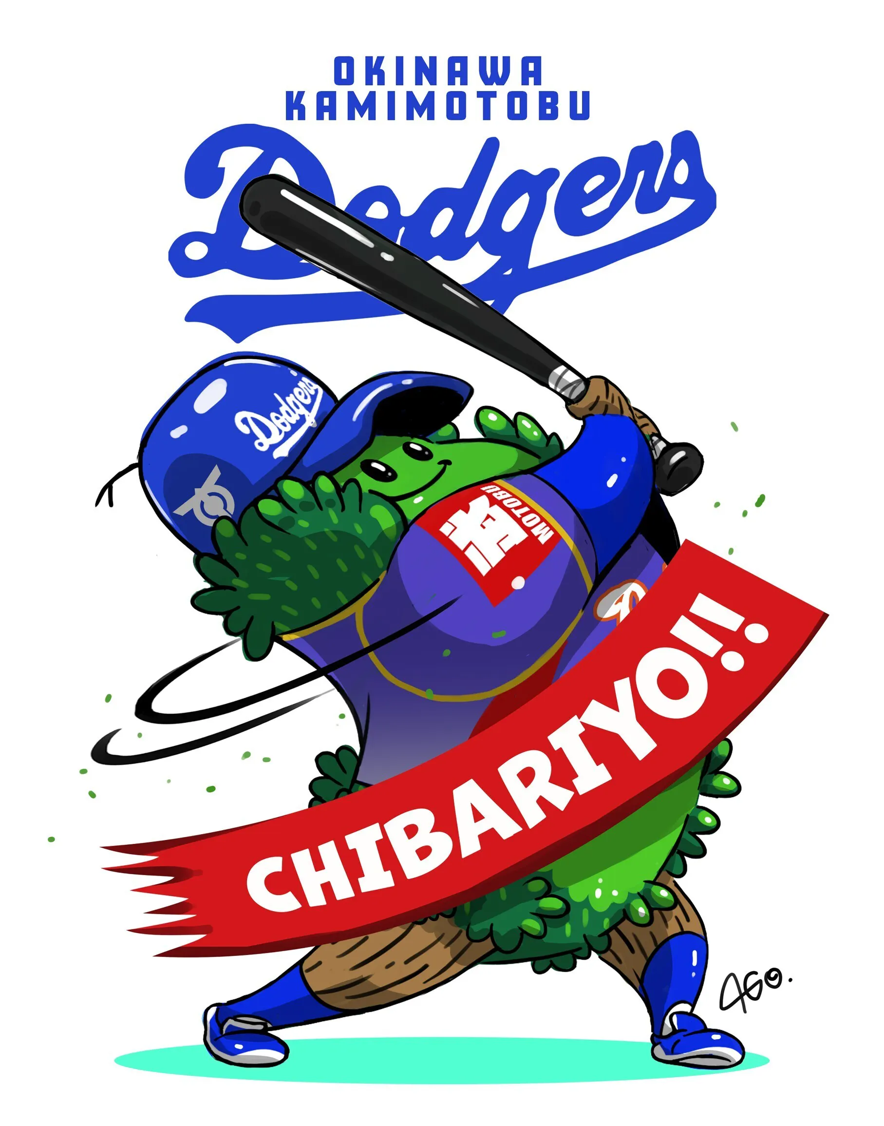 琉球ゴールデンキングスの【ゴーディー】やFC琉球の【ジンベーニョ】等のマスコットデザインを手掛けている城間英樹さんが「出身の本部町にキャラクターを通して恩返しがしたい」との想いから上本部ドジャースのキャラクターをデザイン応援してくれる事になりました!ちなみに、本部町のイメージキャラクター【ぶトモー】や上本部学園の校章とキャラクターも城間さん制作です!