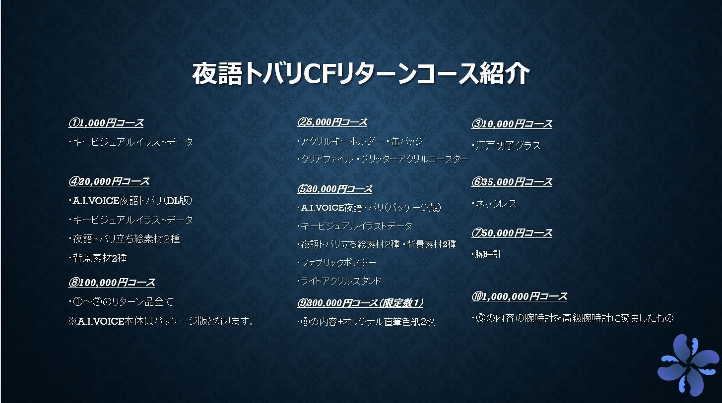 2025/05/09 18:00お世話になっております。以前は夜語トバリのクラウドファンディングのご支援誠にありがとうございました。以前皆様のご支援によって実装になったA.I.VOICE夜語トバリですが、現在新しい試みとして『暁記ミタマ・夜語トバリVOICEVOX化』に向けたクラウドファンディングを行っています。<クラウドファンディングページ>https://camp-fire.jp/projects/822421/view現在初期ゴールの300万円「暁記ミタマのVOICEVOX化」はすでに達成し、第二ゴールの600万円「夜語トバリのVOICEVOX化」を挑戦中です。VOICEVOX版は声優はA.I.VOICEの際と同じ行成とあさんを予定しており、A.I.VOICEでは28歳の設定ですがVOICEVOX版はは高校生の設定となり、声質も異なるソフトとなる予定です。夜語トバリの新しい姿をお見せするために、よろしければご支援いただけますと幸いです。 もっと見る返礼品の発送について