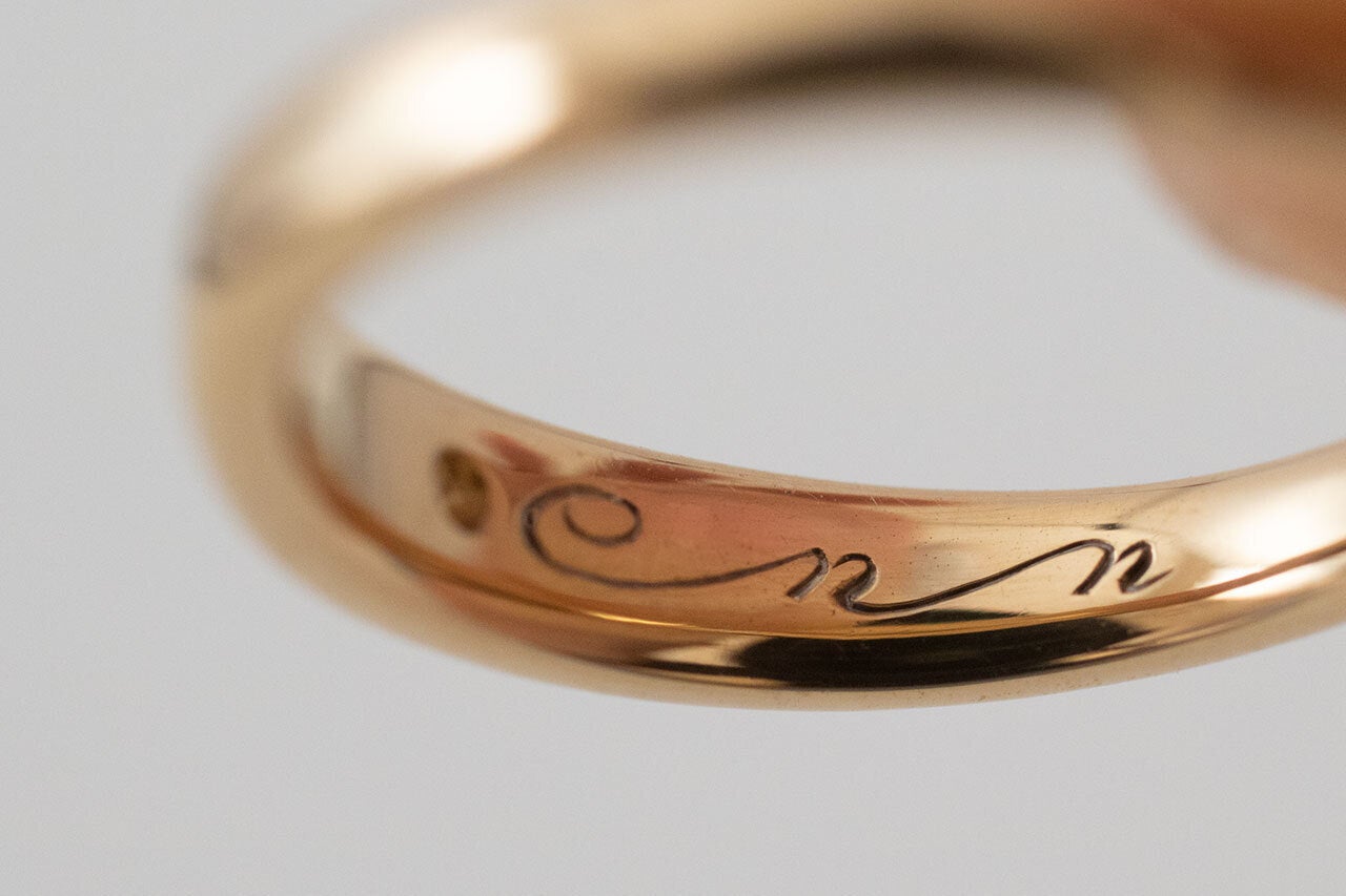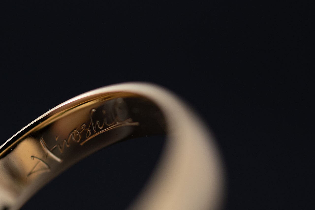 100年200年先に残す指輪には、持ち主のシグニチャー(サイン)を職人の手で彫り入れていきます。