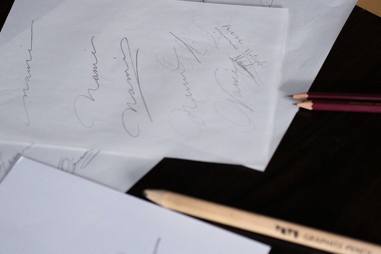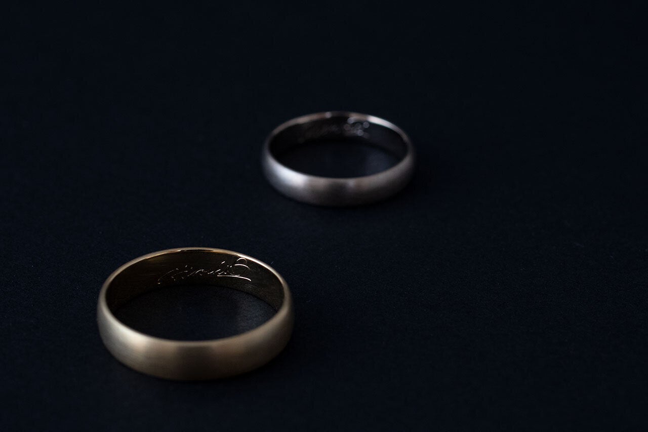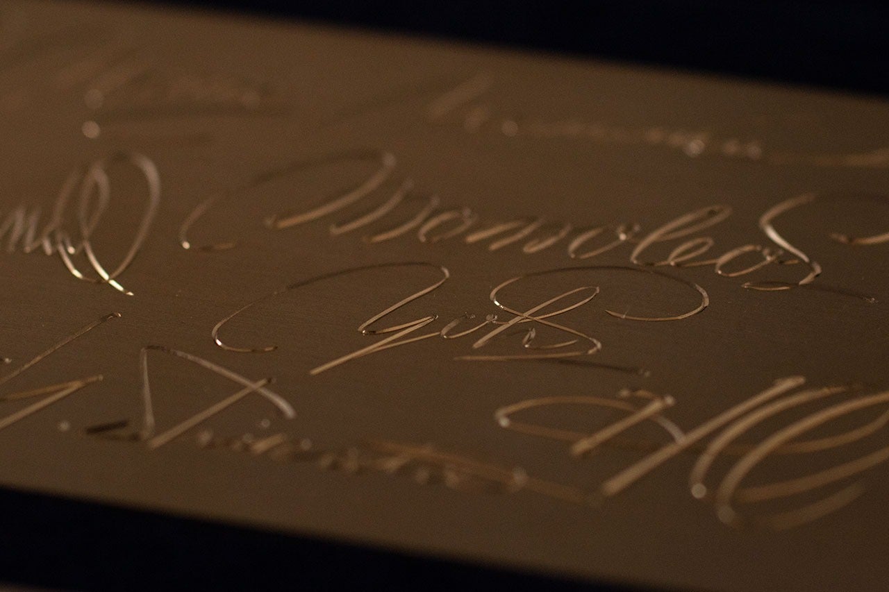 まるでペンで一筆書きしたかのようなシグニチャー。彫りの技術だけではなく、文字に対する職人の思いが伝わってきます。つなぐたびに増えていくシグニチャーが、家族の歴史となっていきます。