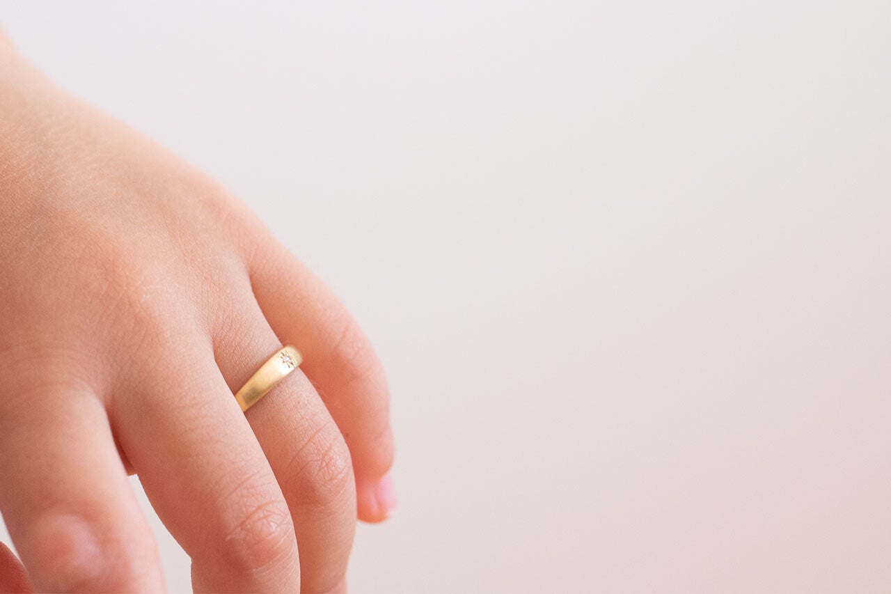 小さな小さな1本ですが、決して華奢になり過ぎることなく、伝統的な「月甲丸」型でお仕立てしています。指輪の中心にはその強固さと輝きから、「永遠に続く強い絆」という意味ももつ、小さなダイヤモンドを彫り留めています。