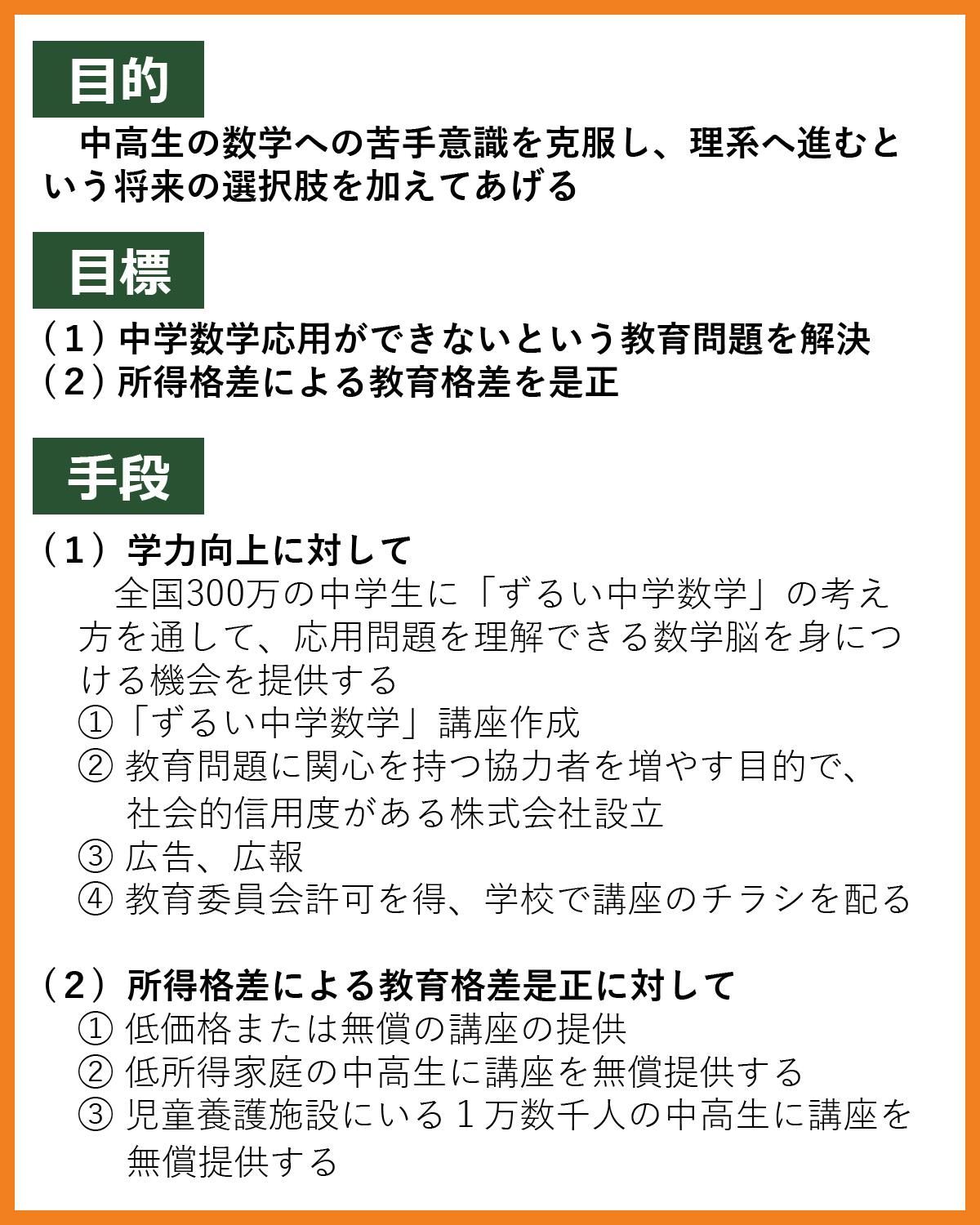 クラウドファンディングを手段の第一歩とし「ずるい中学数学」オンライン講座を開発します。中3の平均教育費が37万円だそうです。教育格差が所得格差からという報告もあります。教育格差是正のため、難関校〇〇人合格をうたい文句とした高額講座ではなく、義務教育すべての生徒にこの講座が行き渡ることを目標とし、月額1000円(来年度より)という価格に設定しました。この教授内容が成功するかどうかはやってみなければわかりません。しかし、このままでは中学の段階で数学で挫折するこどもばかり送り出しているという「事実」は続いていきます。とはいうものの、一度に全員に行き渡らせることができない以上、初めのうちはこの講座を履修した受験生が数学応用問題に対して有利な立場に立ち、新たに情報格差による教育格差を生むこととなってしまいます。この「ずるい中学数学」を学びたい子たちに知ってもらうためには、中学校でチラシを配ることが一番効果的なのですが、教育委員会の許可をえるためには法人格である必要がありそうです。そのため、このプロジェクトの一番大きな出費は会社設立費とその維持費となります。このプロジェクトで示した数学教育の問題点に関心をもたれた教育委員の方々、または教育委員会または学校長にこの講座を推薦していただける方、こどもたちのため一緒に数学教育改革を行ってください。ご連絡お待ちしております。普及のための出張講演を行います。リターンに項目がありますので、応用問題を生徒に習得させたいと願う先生方、保護者の皆様、学習塾経営者、他、学校教育に関心のある方々のお申込みお待ちしております。また、講座内容を一緒に作ってみたいとお考えの若い教育者の方も歓迎します。いま、テレビドラマでも話題のEdTech(EducationとTechnologyをかけた造語)として、学習アプリが学校での補助教材として注目を集めるようになったように、補助教材として使ってみたいという方がいらっしゃれば、学校、学習塾、家庭教師、問わず歓迎いたします。多くのこどもが中学数学を楽しいと思える「ずるい中学数学」教育の普及にご賛同いただければ幸いです。