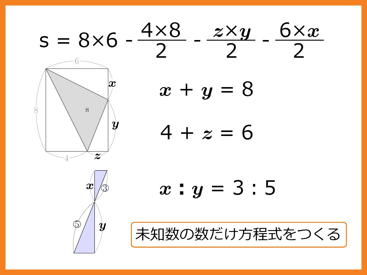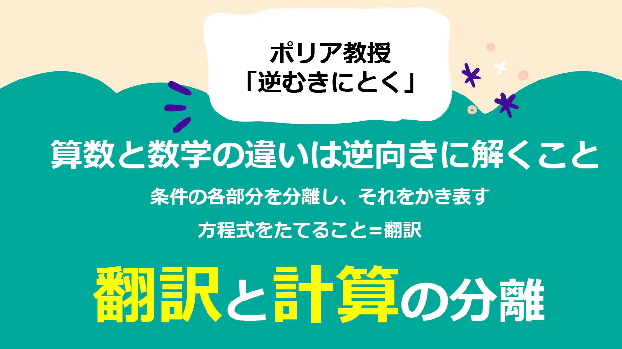 「ずるい数学」は、問題を出題条件ごとに分割し、各条件を方程式に「翻訳」し、連立方程式を「計算」することです。