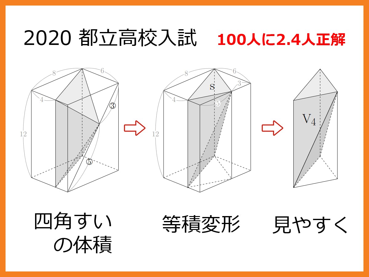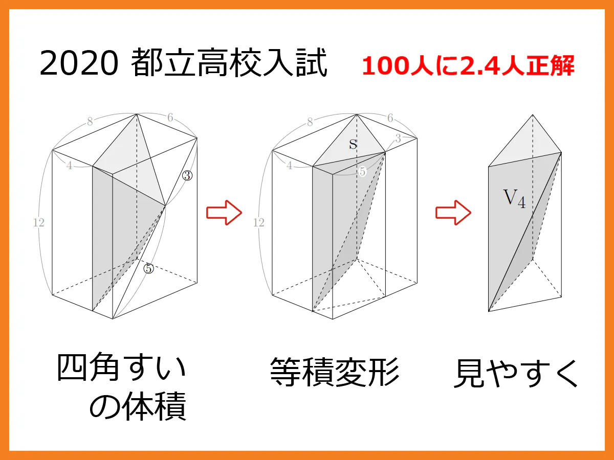 (1) 底面積と高さが同じ、つまり同じ体積の四角すいへ変形(等積変形)する。