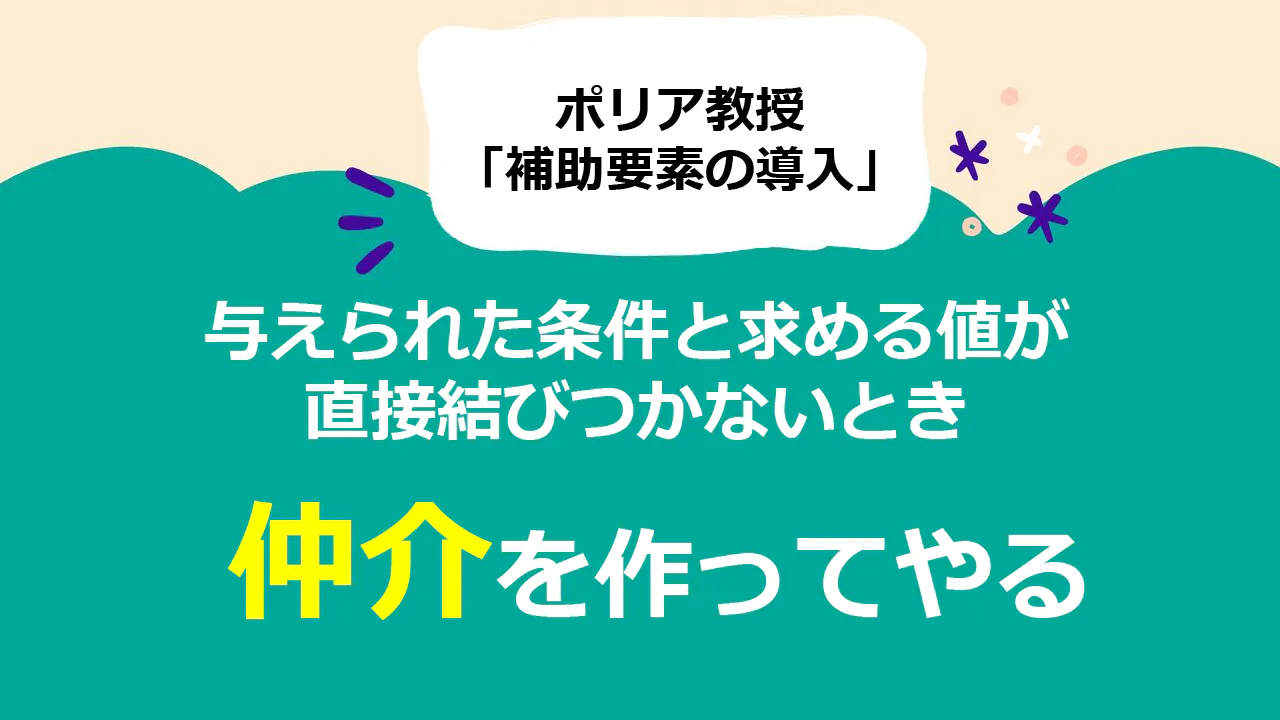 ポリア教授の言葉は、「問題をいいかえること」だけではありません。例えば都立高校入試の平面図形(大問4)の問題は辺の長さが既知の三角形と求めたい辺の長さを1辺に持つ三角形が直接結びつかず、難問といえます。ここでは「補助要素の導入」の考え方が使えます。仲介役の三角形を通して答えを導き出します。ちょうど、目的地に行くのに、地図を仲介として計画をたて、現実に戻って計画を実行することに似ています。ちなみに、地図を使うのは「問題をいいかえること」でもあります。
