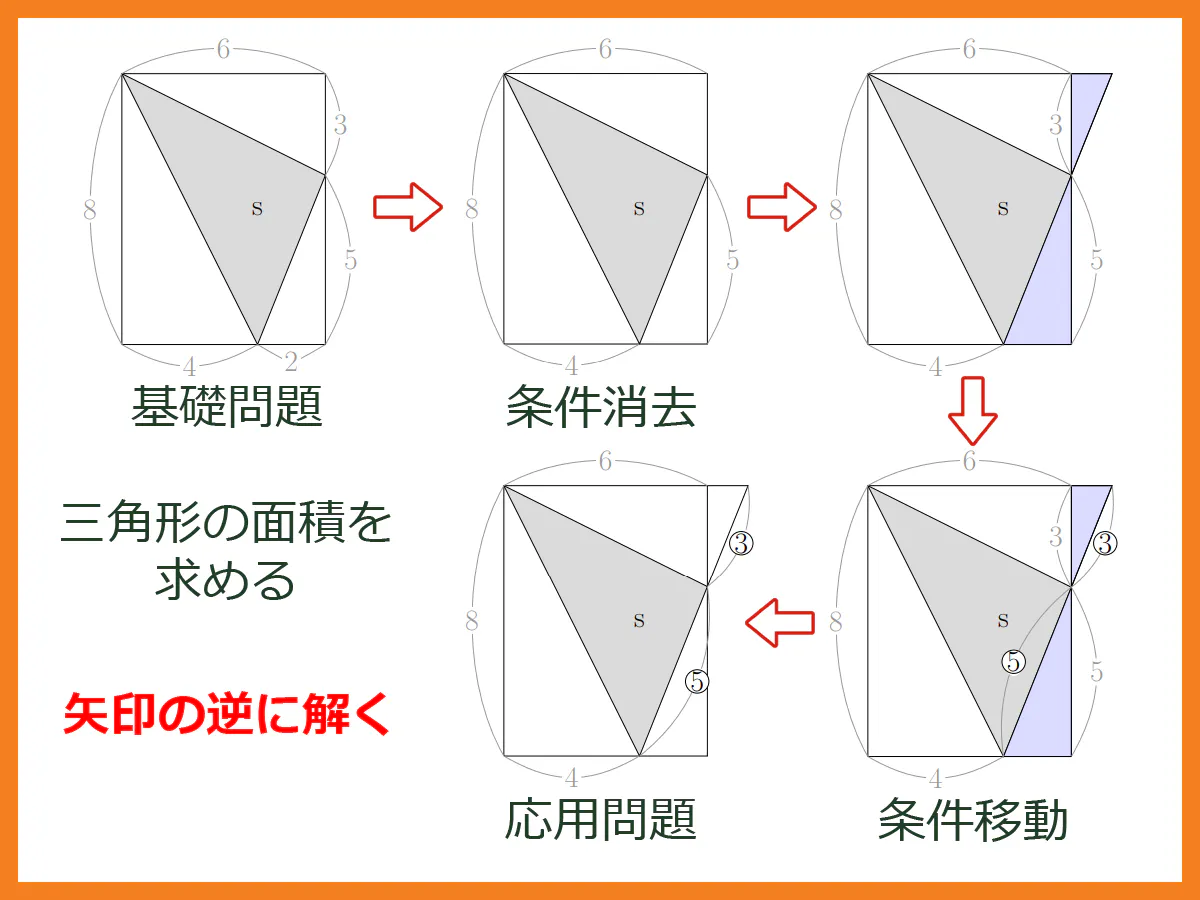 応用問題を見ての着眼点は基礎問題の3または5、そのどちらかの位置にある値です。これが無いと三角形の面積が求まらないので、この数字をどこかから引っ張ってくる。