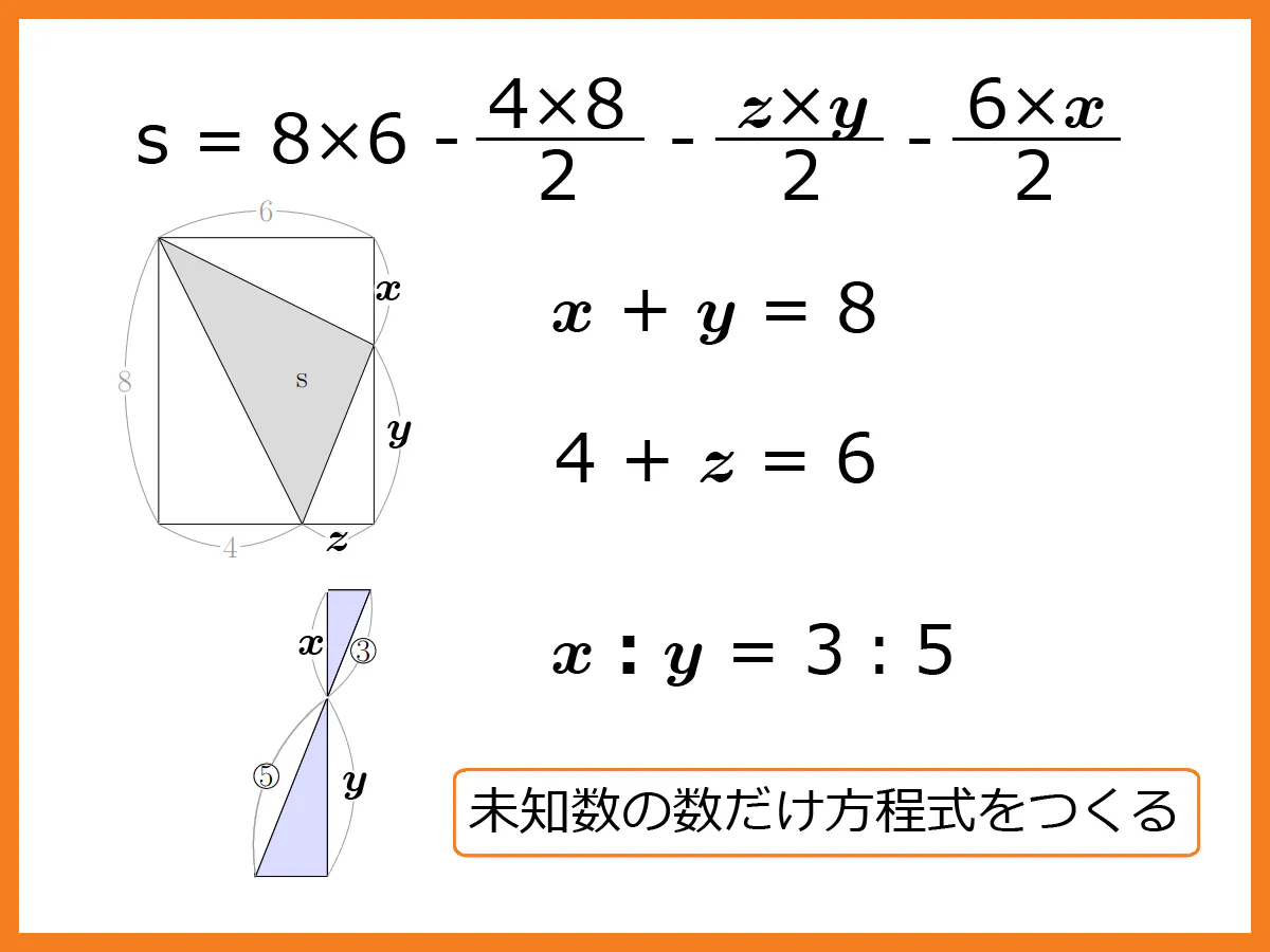 与えられている条件は3:5なので、これを使って基礎問題の3または5の位置に入る値を求める。