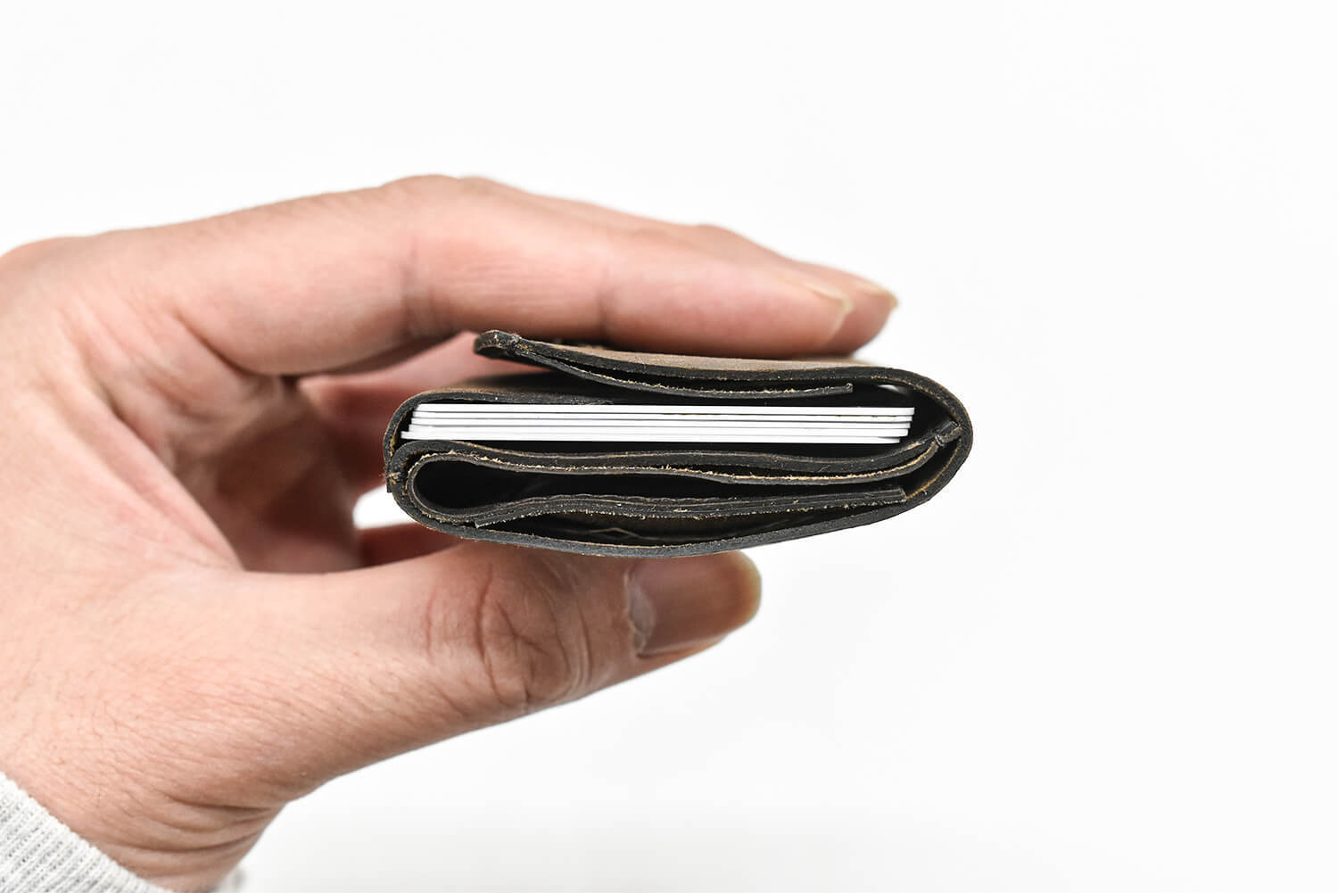 使い勝手が格段に向上し、さらにはファスナーなどの付属を取り除くことで、財布自体の厚みは僅かに1.2cmとなっています。