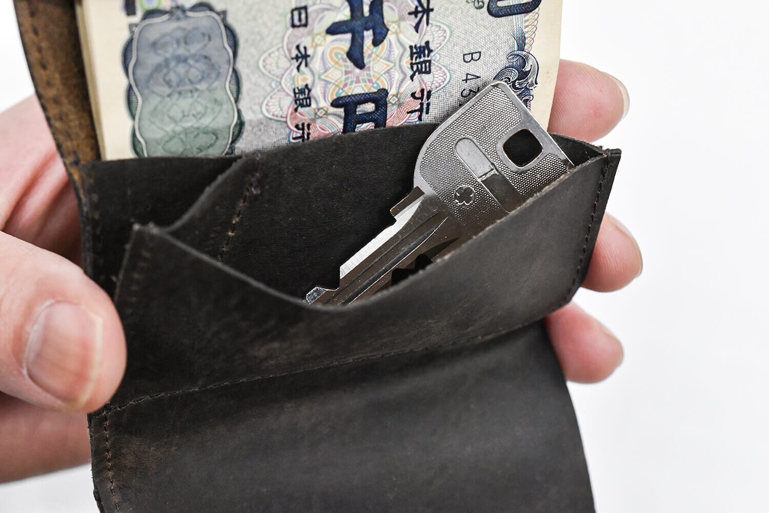 小銭が必要ない場合や、別でコインケースを持ち歩くという方はポケット部分にフレキシブルな収納も可能です。鍵などの小物の収納場所としてもお使いいただけます。