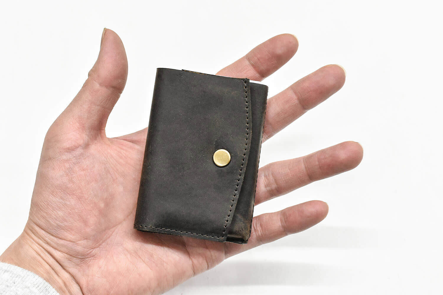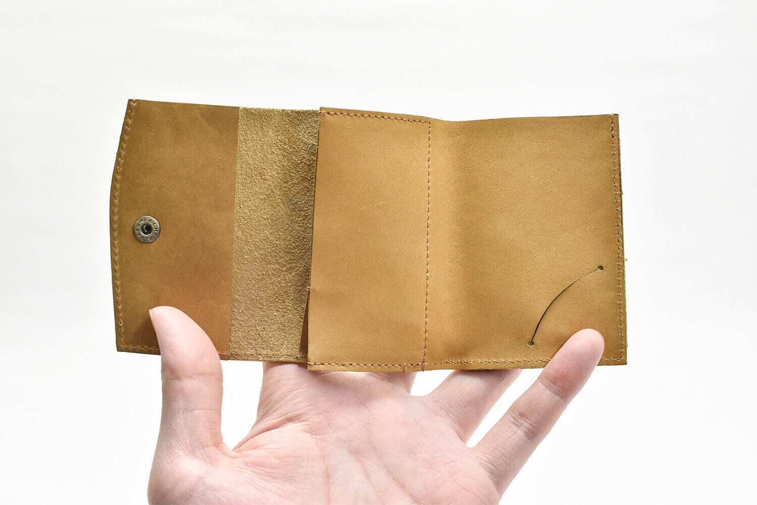 ホック側の革の側面は縫わずに仕上げることで「札仕切り」の役割を果たします。