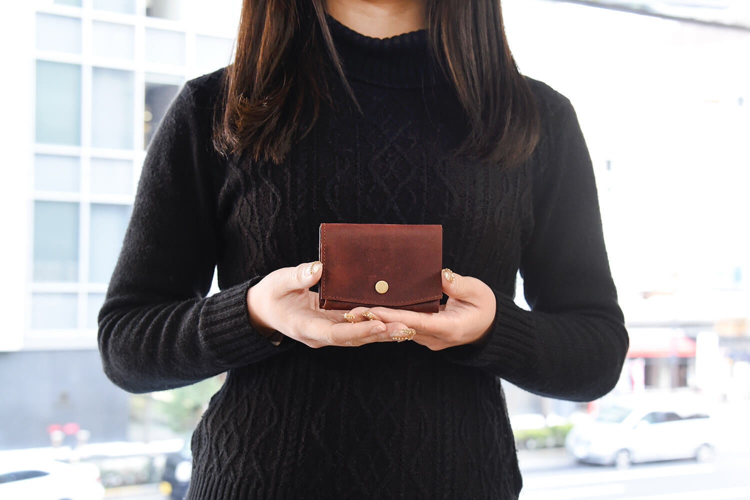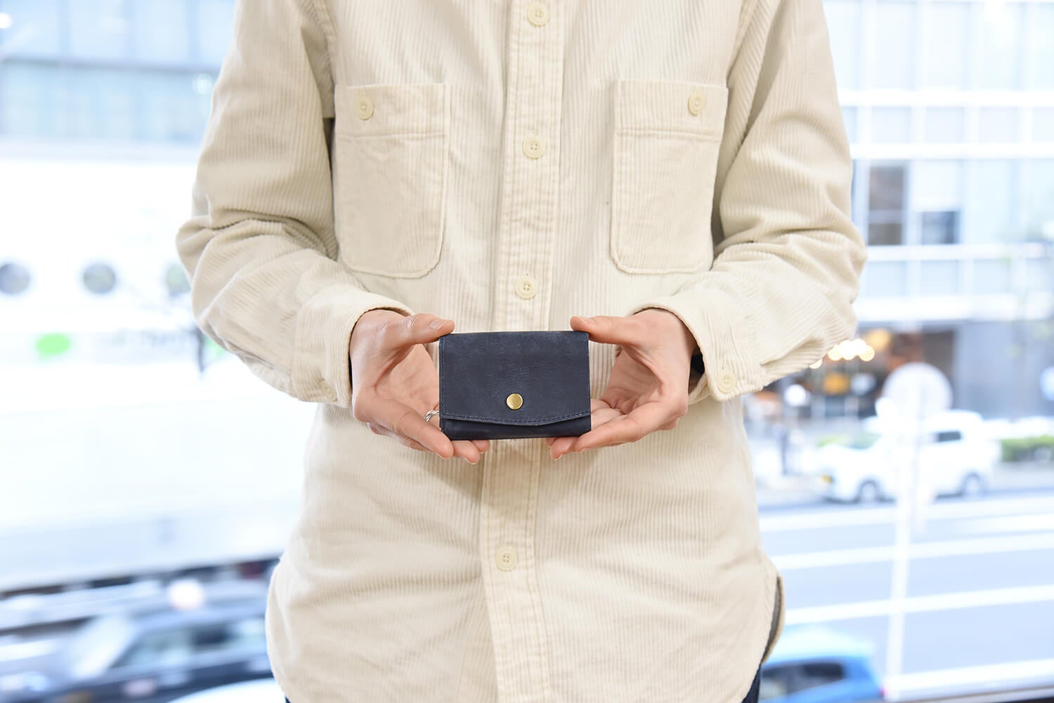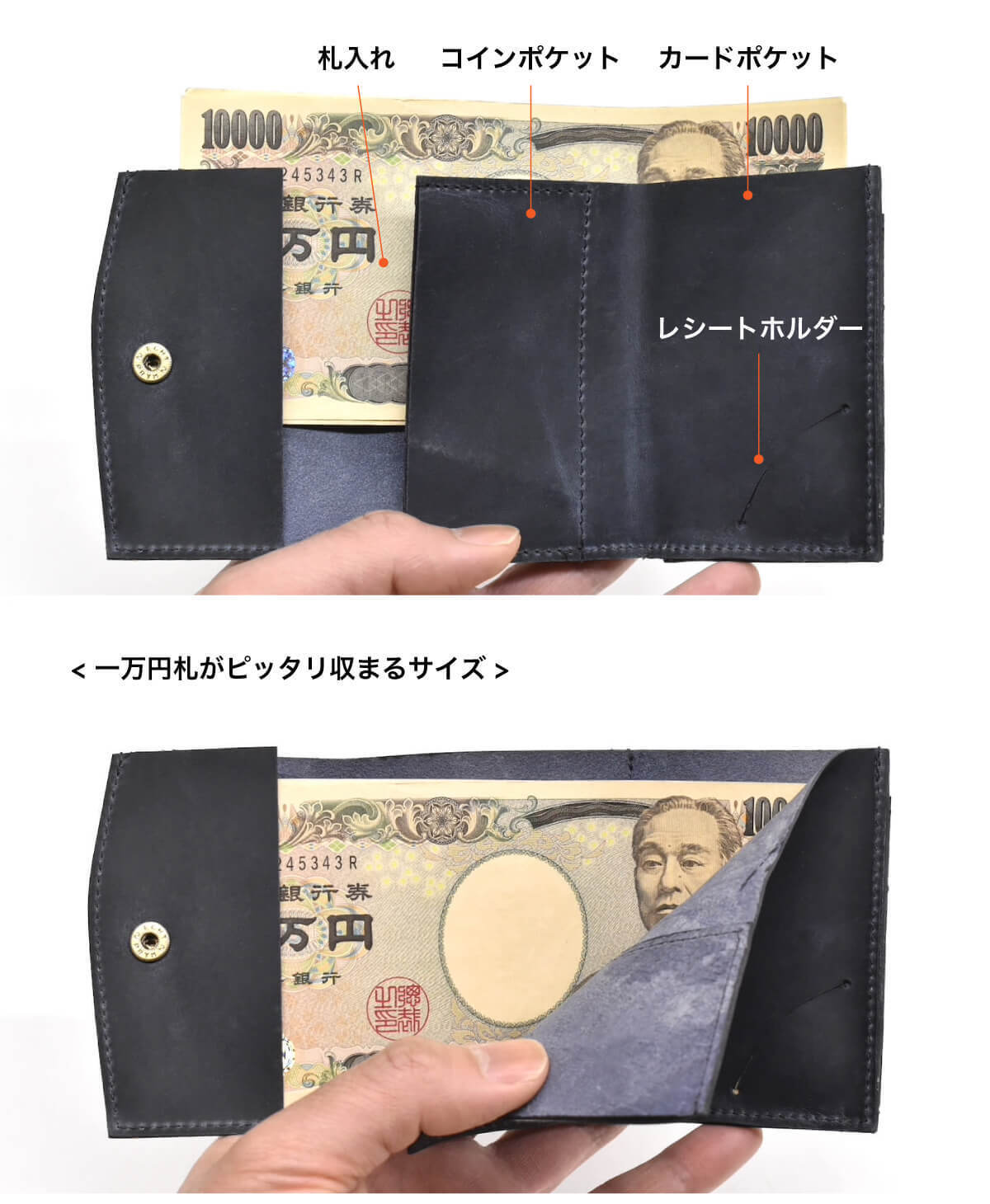 三つ折りを広げれば、一万円札がピッタリ収まる。長財布のような使い心地です。