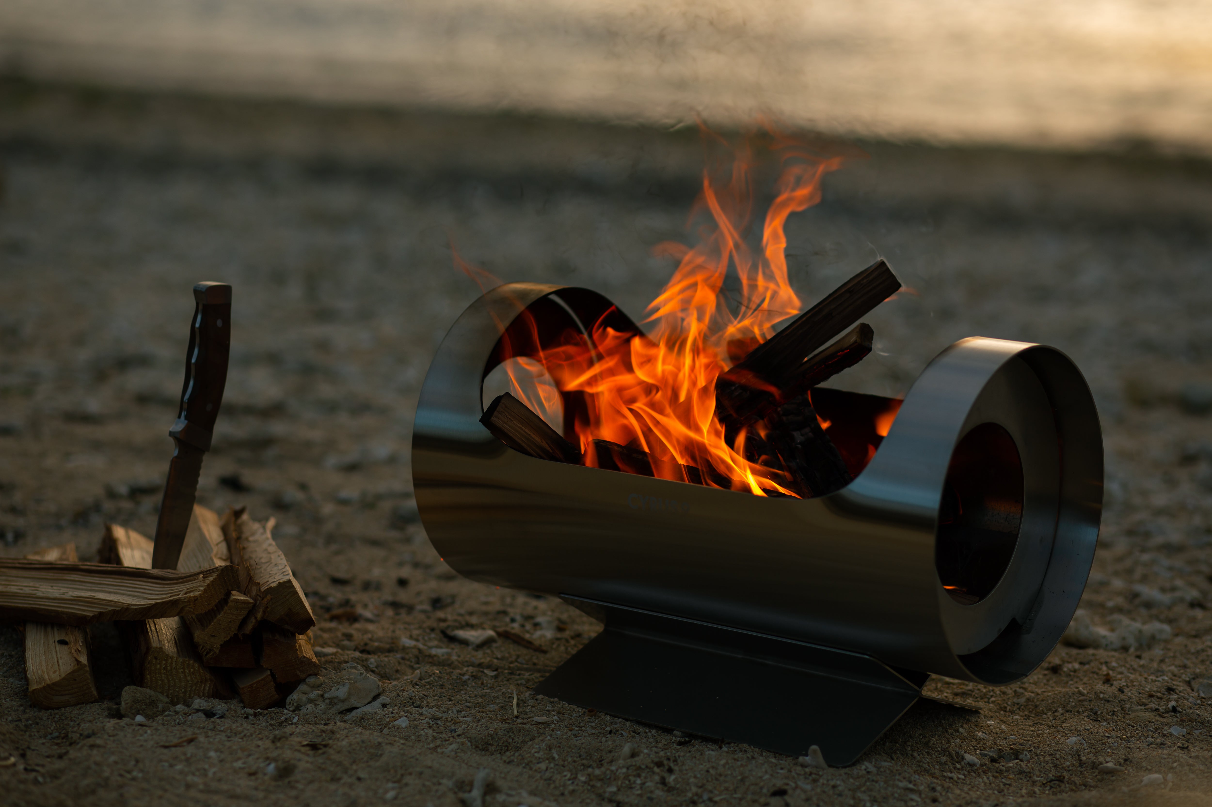 こちらはフォームチェンジしたWindモード。開口部を自分側に向けることにより、リフレクターとして輻射熱を得られ、さらに風をさえぎる。筒状のボディはサイドに大きな通風口を持っているため、厄介な風を遮りつつも必要な空気は取り込むことができます。