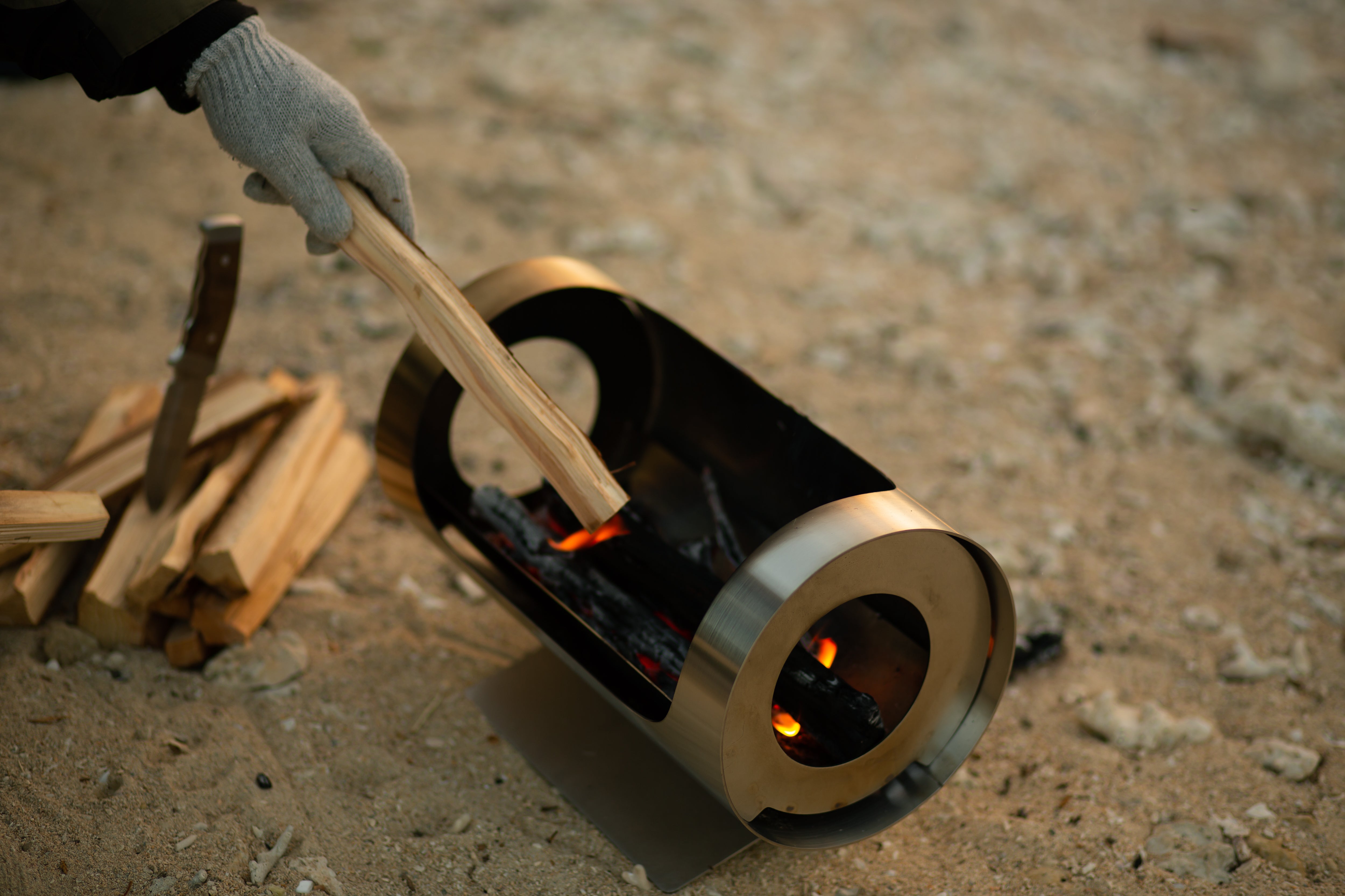 おはようございます。円柱状の新構造の焚き火台Flame in the Windは、市販の30~40㎝ほどの薪がそのまま入れられるようになっています。開口部からも入れられますが、40㎝を超える長さのものも横のホールからも入れることが可能です。設置だけでなく、キャンプ場で販売されている薪をストレスなく入れられるようになっています。